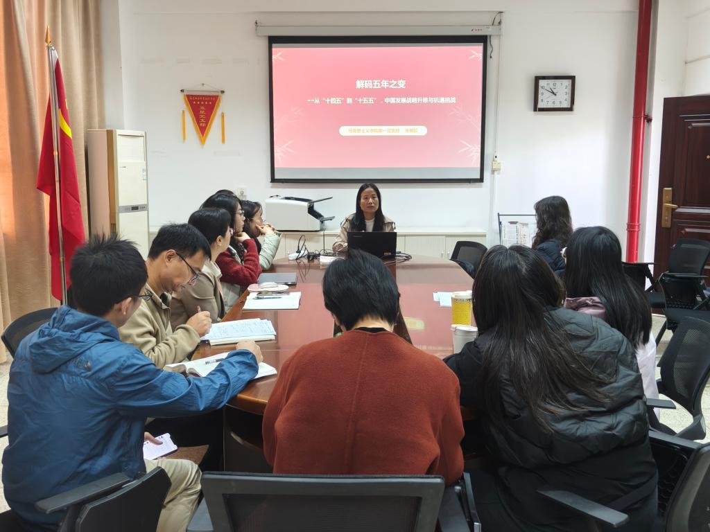 为深入学习宣传贯彻党的二十届四中全会精神,落实立德树人根本任务,2025年12月4日,马克思主义学院第一党支部书记来朋珍在厚德楼107会议室开展《解码五年之变:从“十四五”到“十五五”,中国发展的战略升维与机遇挑战》专题党课。