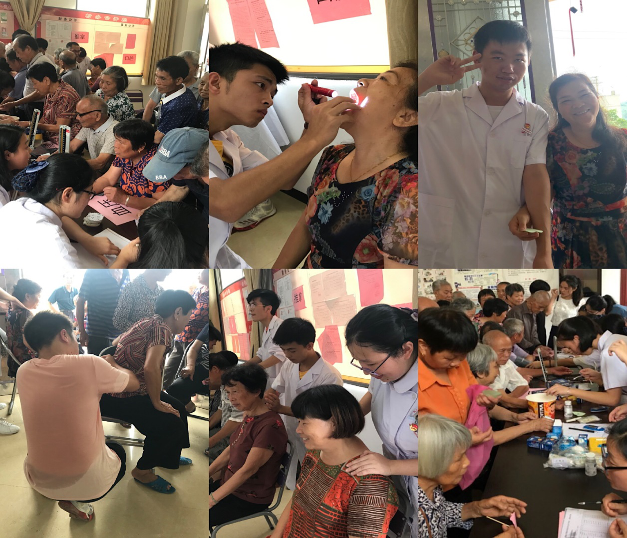 7月7日上午,实践队在新民村村部开展爱心医疗义诊活动,前来就诊的村民络绎不绝,在导诊同学的引领下,测血压、血糖,推拿、按摩,测视力、检查口腔,问诊、取药等有序不紊进行着,为现场七八十位老乡免费发放了上千元药品。同学们在与淳朴自然的村民洋洋洒洒的互动中,累并快乐着,汗水将他们的衣服浸湿,对每位村民的尽职尽责和耐心的态度受到村民们的点赞肯定。通过义诊活动,让同学生们感受到了运用自己所学的医学知识去帮助别人是多么快乐的一件事,也更让他们体会到了农村对医疗的渴望。