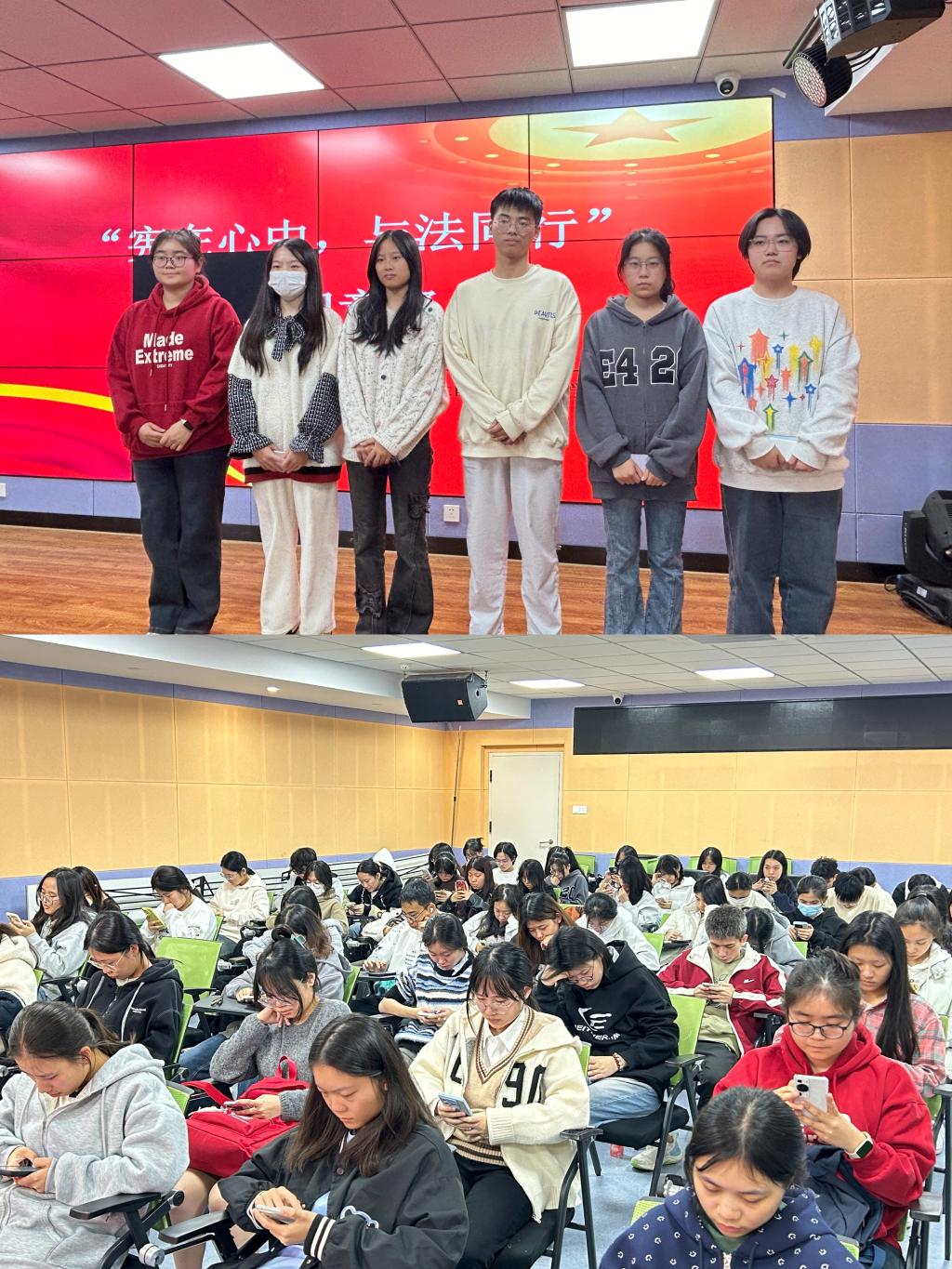 “执宪法之灯,谱盛世华章”主题征文活动现场气氛热烈,参赛选手全情投入,通过文字描绘出自己心中法治社会的蓝图,共同探讨宪法精神在现代社会的重要性坚定自己学法、用法、守法的决心。“宪在心中,与法同行”知识竞赛内涵丰富,竞赛内容涵盖了宪法的历史、基本原则、重要条款等多方面,旨在全面考察参赛者对宪法的理解和掌握程度。比赛现场选手们纷纷展现出自己的智慧和才华,激励着大家了解更多宪法和法律常识,让学生群体增强法治观念,将尊法学法守法用法深深地镌刻在心中。