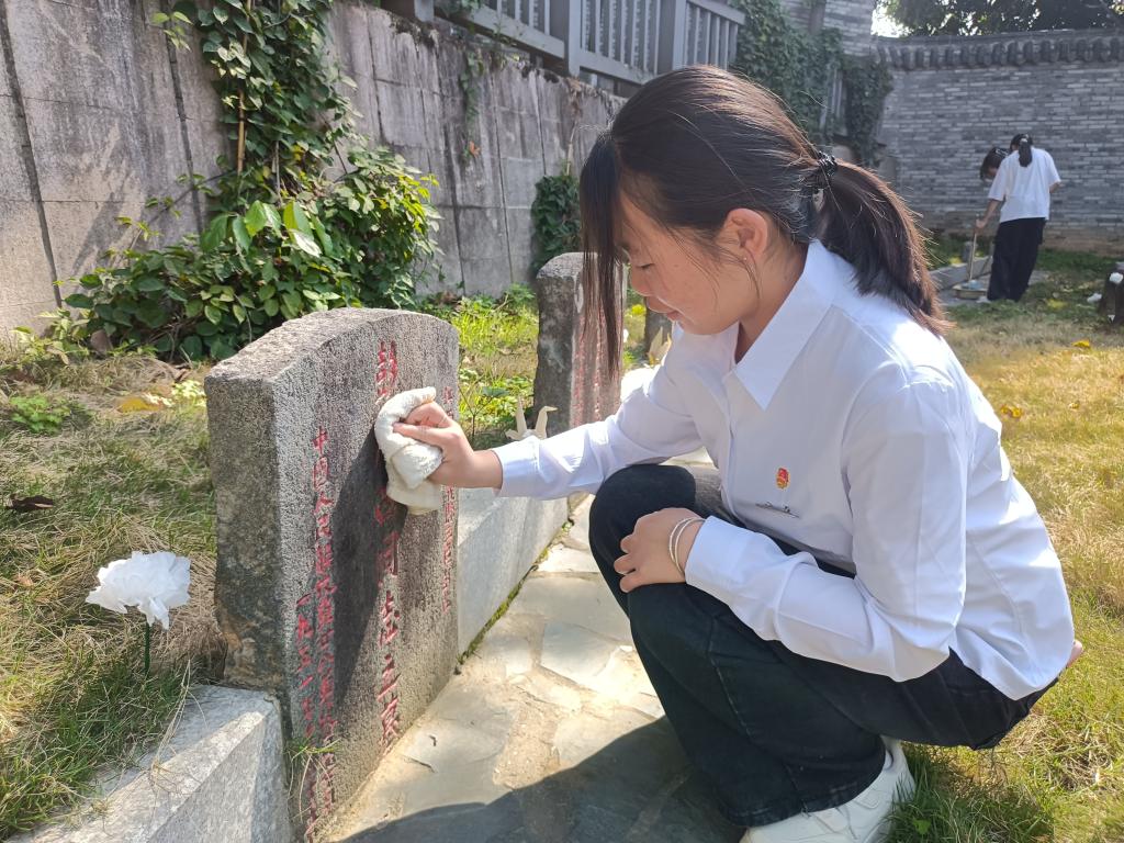 默哀后,师生代表先后发言。教师代表胡济林强调要铭记历史,珍惜来之不易的和平生活,将红色精神代代相传,为建设中国特色社会主义现代化强国而奋斗。学生代表林俐表示要向革命先烈学习,传承红色精神,努力学习,做社会主义建设者和接班人。 随后,同学们纷纷拿起工具,清扫陵园地面的落叶与杂物,擦拭烈士墓碑,以实际行动表达对先烈的敬重。
