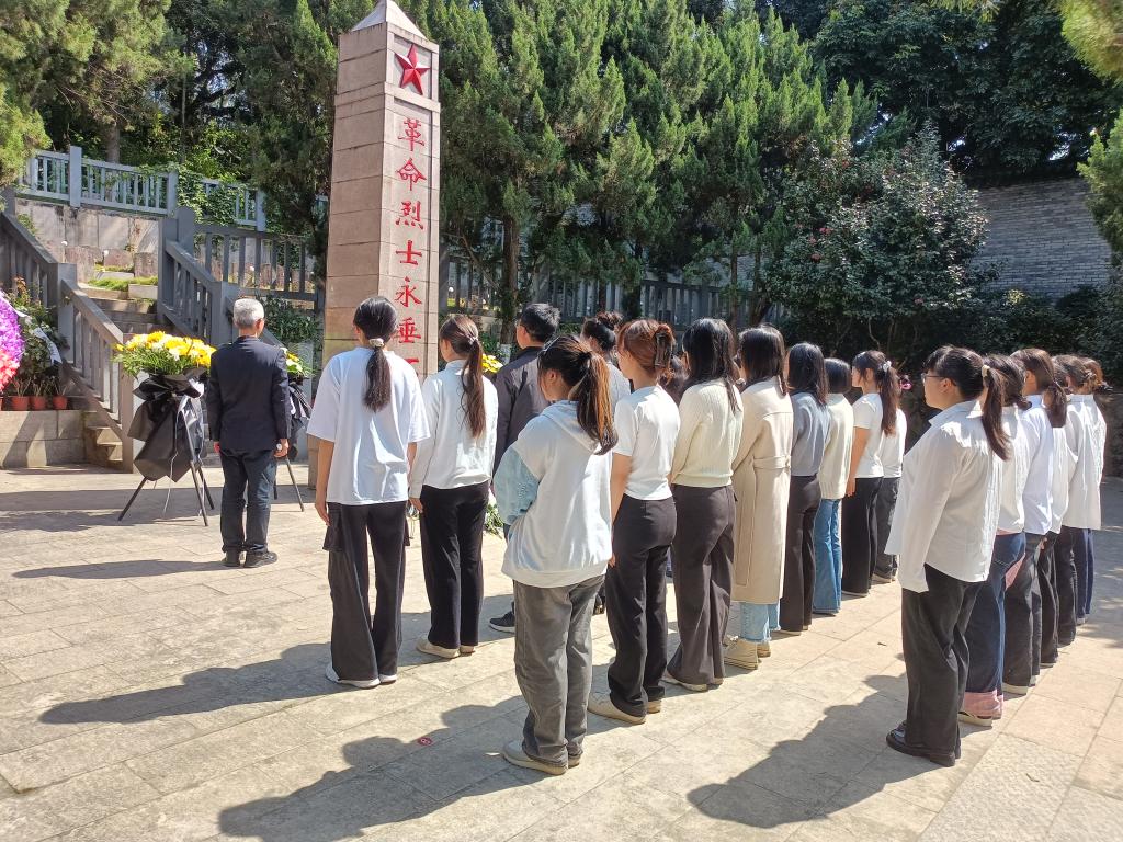 在烈士纪念碑前,全体人员怀着崇敬的心情,面向“革命烈士永垂不朽”纪念碑高唱国歌,激昂的旋律在陵园上空回荡。唱毕,大家依次缓步向前,献上手中的花束,向烈士们致以深切的缅怀。献花结束,全场肃立,师生们低头默哀一分钟,沉痛悼念那些为了国家独立、民族解放而英勇献身的烈士们,陵园内弥漫着深沉的哀思。