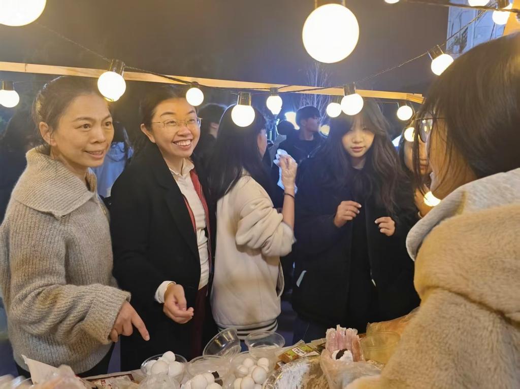活动伊始,悠扬的民乐合奏拉开序幕。社长结合着春节文化内涵讲解年俗相关知识,让同学们在乐声中读懂“阖家团圆、辞旧迎新”的节日寓意。随后的民俗体验环节里,包饺子比赛中社员们分组协作,干事们从饺子外观与工艺细节评分;汤圆制作区域同样热闹,大家揉面团、包馅料,亲手制作软糯香甜的汤圆,为新年添彩。活动中,副校长黄铭珊来到摊位前与同学们亲切互动,仔细询问大家的制作过程与体验感受,耐心倾听同学们分享对年俗文化的理解,鼓励同学们多关注民俗文化,做传统文化的传承者与传播者。社员们在动手实践中体验传统年俗魅力,在互动协作里加深彼此情谊,厚植了对中华优秀传统文化的认同与自信。