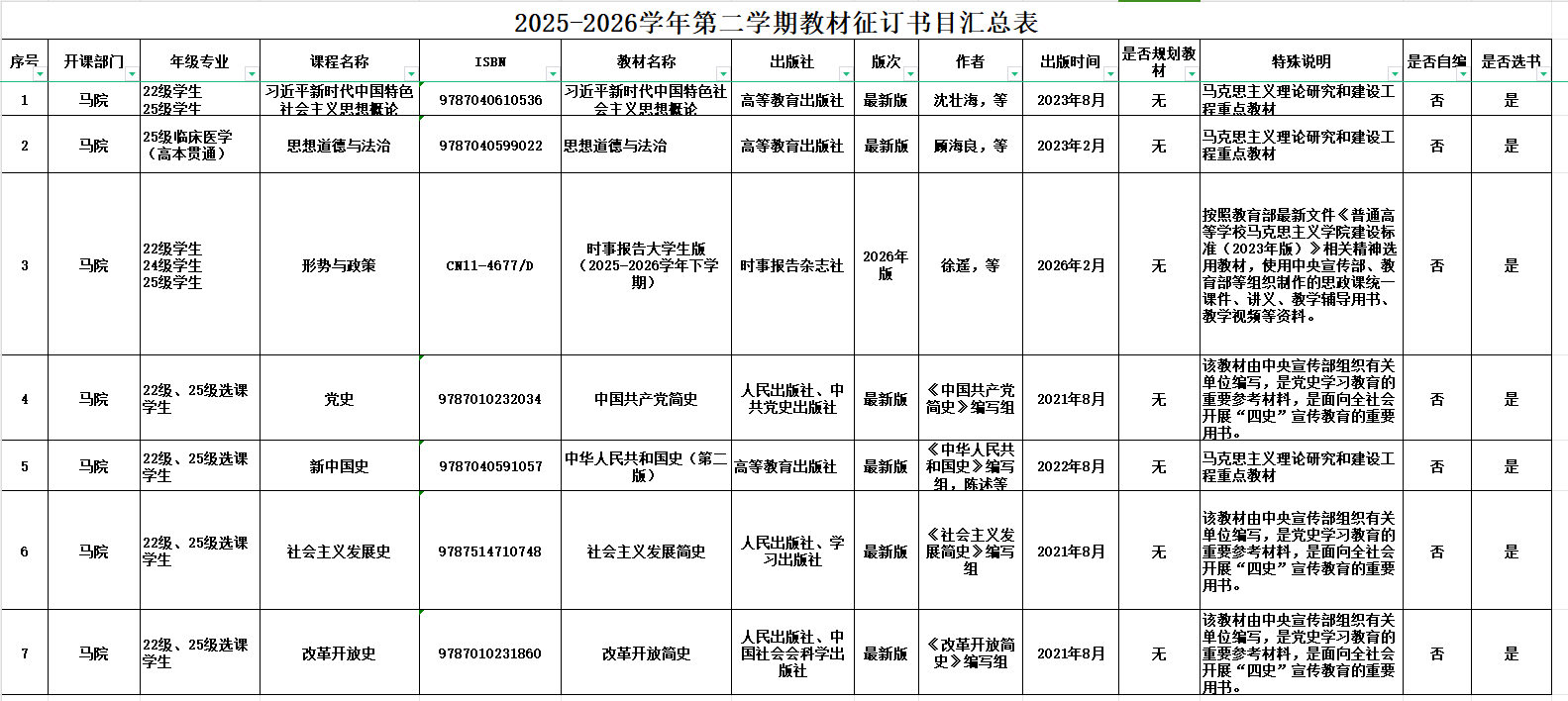 根据教务处下发的教材选用通知,经各课程负责人、教研室主任初审,马克思主义学院教材建设小组审核,拟定2025-2026学年第二学期教材选用情况如下: