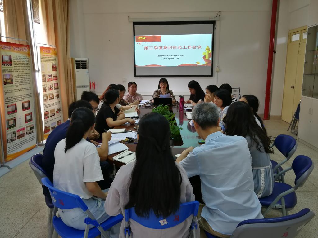 2020年9月17日上午,直属马克思学院党支部在行政楼107马院会议室召开2020年第三季度意识形态工作会议。会议由直属马克思学院党支部书记熊美兰主持,直属马克思学院党支部全体党员参加了会议。