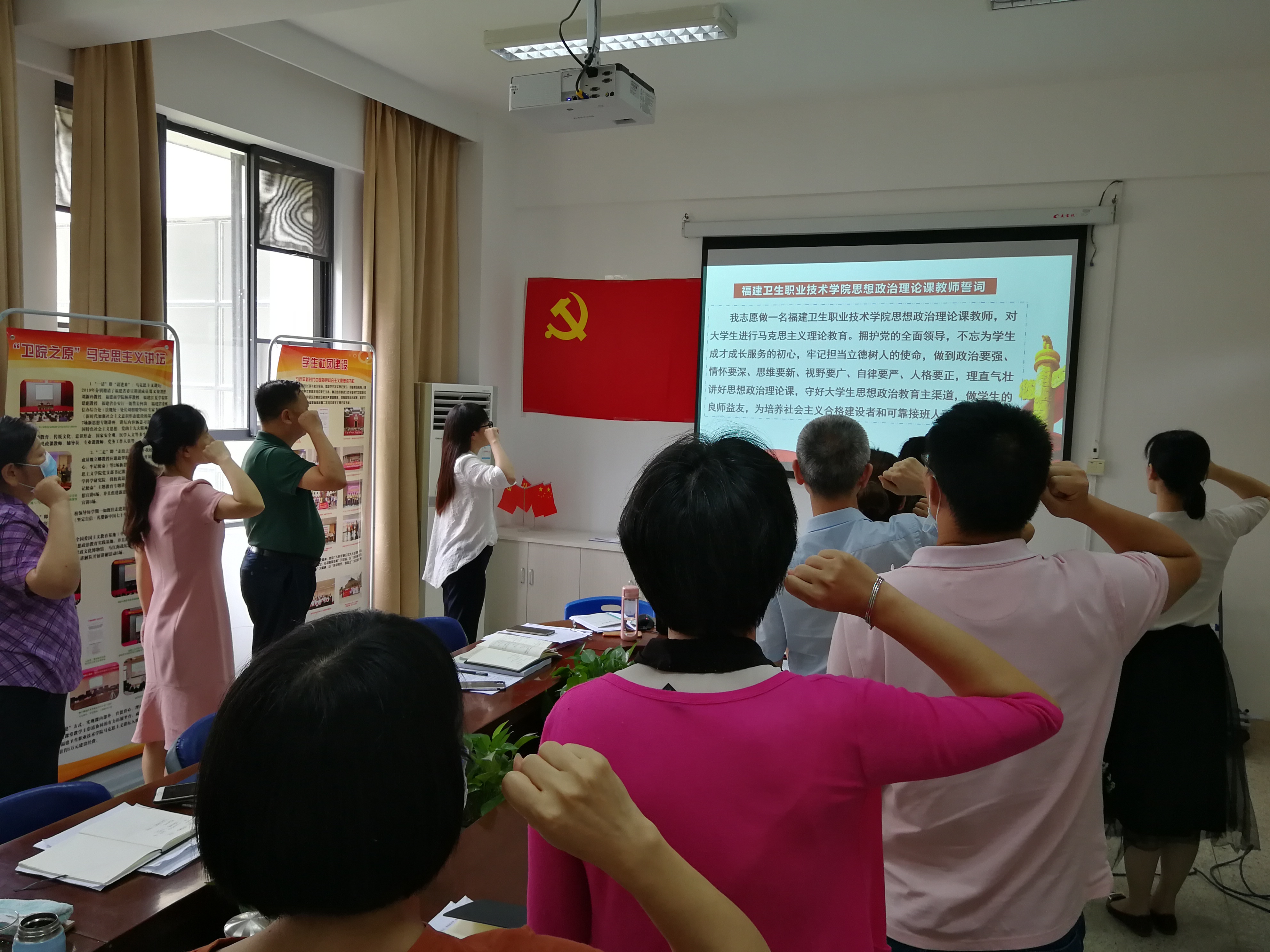 接着,举行新转正党员入党宣誓、支部老党员重温入党誓词;思政课教师宣誓。面对党旗,新转正党员、支部老党员重温入党誓词,共同庆祝“政治生日”。在庄严的宣誓声中,“初心不改,99如一”的信念激荡在每位党员的心头,党员们都表示要把初心和使命落实到教书育人的本职岗位上,充分发挥先锋模范作用,勇挑重担,扎实工作,不断为学校事业建立新的功绩。