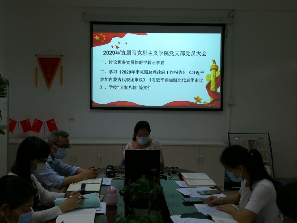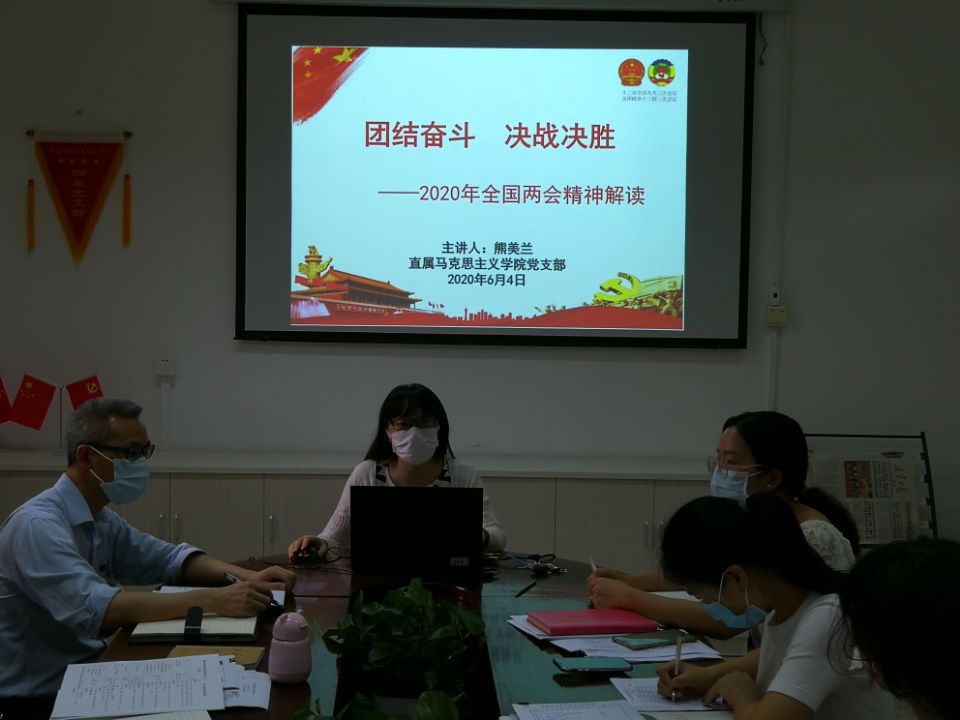 为深入学习2020年全国两会精神,促进两会精神贯彻到实际工作中,2020年6月4日,直属马克思主义学院党支部在行政楼107开展了2020年全国两会精神专题学习活动,全体党员教师参加了活动。