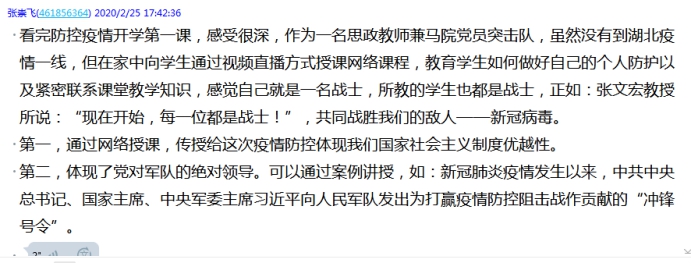 张崇飞老师表示,看完张文宏教授和吴凡教授防控疫情开学第一课,感受很深,作为一名思政教师兼马院党员突击队队员,虽然没有到湖北疫情一线,但在家中向学生通过视频直播方式授课,教育学生如何做好自己的个人防护,感觉自己就是一名战士,所教的学生也都是战士,正如:张文宏教授所说:“现在开始,每一位都是战士!”这次疫情抗击,体现了党对军队的绝对领导,体现了我们国家社会主义制度优越性。
