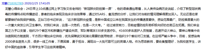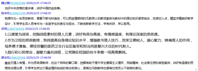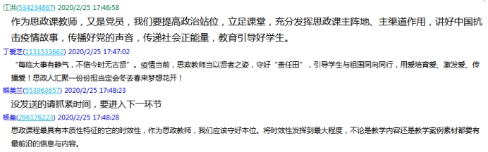 张天文老师:通过学习习近平总书记讲话和昨天张文宏、吴凡专家讲座,今天下午又学习了各位老师的发言,收获很大,我将继续深入学习,促进、提高,做好一名党员和思政教师应有的职责。引领学生树立打赢疫情防控战的信念和信心,我们责无旁贷!