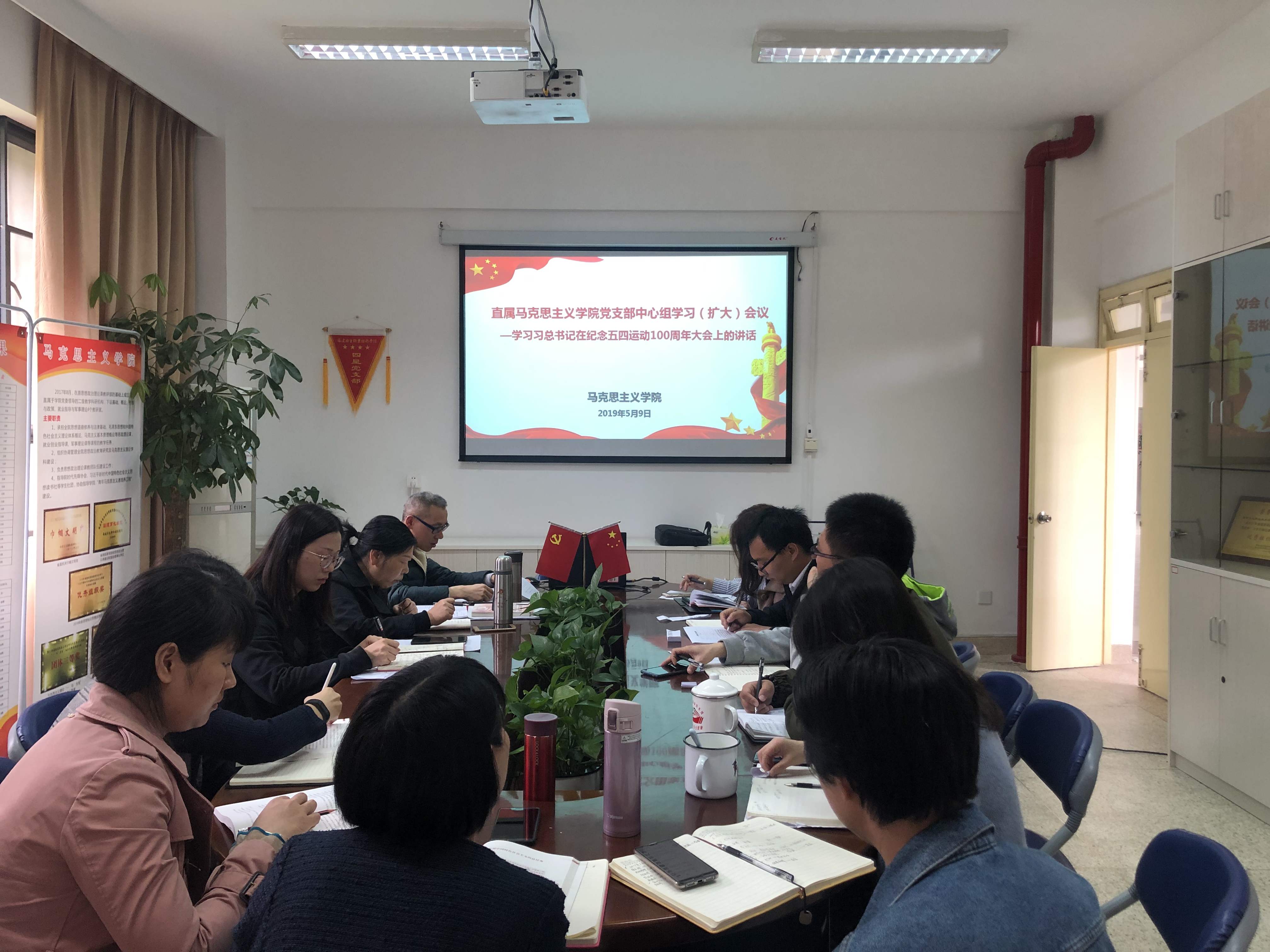 5月9日上午,直属马克思主义学院党支部书记熊美兰主持召开党支部中心组学习(扩大)会议,学习《习近平总书记在纪念五四运动100周年大会上的重要讲话》。