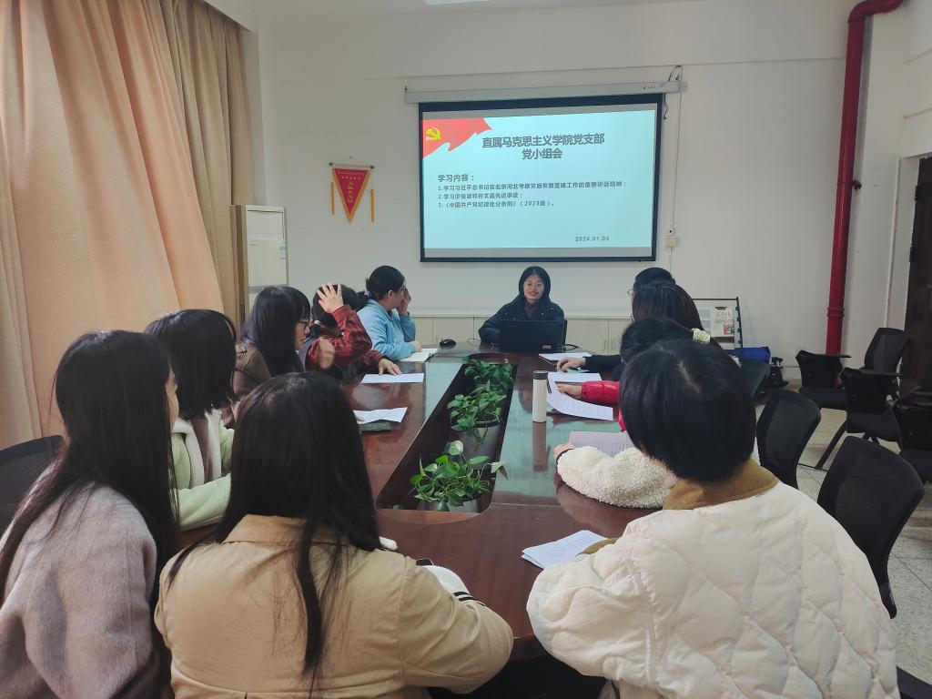 2024年1月4日,直属马克思主义学院党支部第一、第二党小组在行政楼107会议室开展理论学习,由罗芸同志、来朋珍同志主持。