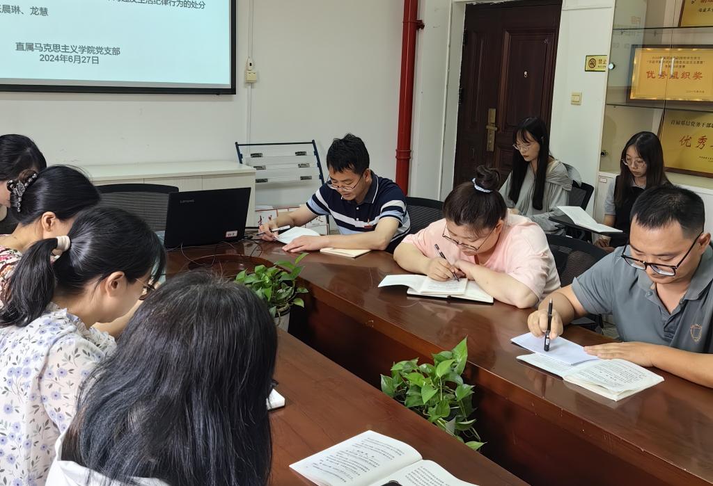 集体学习后,张晨琳同志、龙慧同志进行心得交流。张晨琳结合两门概论课的教学内容,提出以在全党开展党纪学习教育为契机,深刻认识严守生活纪律的重要意义、全面把握生活纪律的内在要求,始终老老实实做人、干干净净做事,努力培养更多让党放心、爱国奉献、担当民族复兴重任的时代新人。龙慧谈道:作为党员在生活中必须严以修身、严以律己,坚决反对享乐主义和奢靡之风,坚决反对一切庸俗、落后、腐化和违背党的理想信念宗旨的行为,自觉遵守家庭美德和社会的公序良俗等生活纪律。