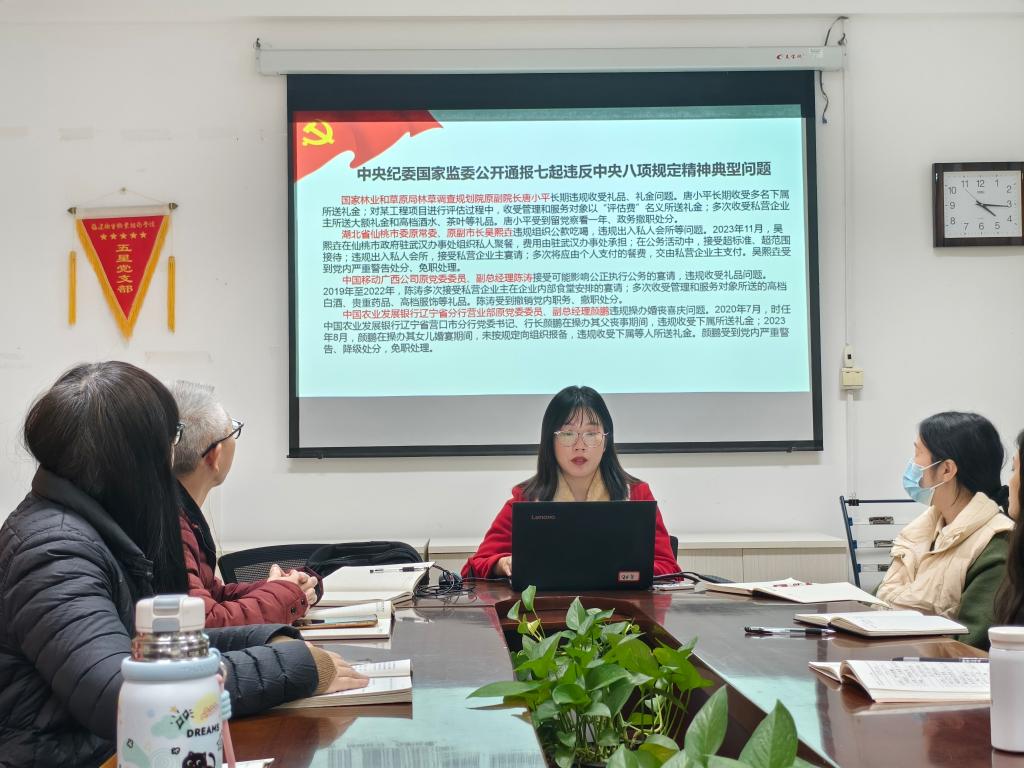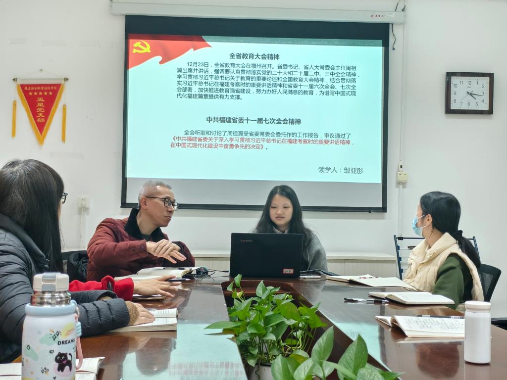 会上,蒋楠同志领学习近平总书记重要文章《深入推进党的自我革命》。文章指出,党的十八大以来,在推进全面从严治党的伟大实践中,我们不断进行实践探索和理论思考,在毛泽东同志当年给出“让人民来监督政府”的第一个答案基础上,给出了第二个答案,那就是不断推进党的自我革命。邹亚彤同志领学习近平总书记在福建考察时的重要讲话精神、中共福建省委十一届七次全会精神、全省教育大会精神。杨盈同志结合2025年元旦春节期间正风肃纪工作,领学中央纪委国家监委公开通报七起违反中央八项规定精神典型问题。