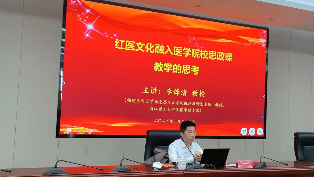 为进一步推进党支部“红医”品牌建设,传承好红医文化基因,培育仁心医者,2025年3月27日,马克思主义学院第二党支部在厚德楼六楼会议室开展“传承红医文化基因赋能新时代思政育人”主题党日活动。此次党日活动邀请福建医科大学马克思主义学院李锋清教授作题为《红医文化融入医学院校思政课教学的思考》的专题讲座。