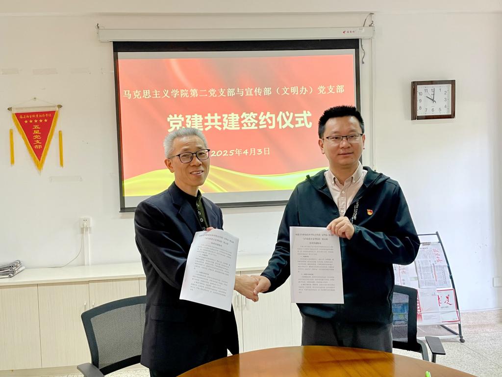为充分发挥基层党支部战斗堡垒作用,推动学校机关党建与学院党建在落实立德树人根本任务上的深度融合,2025年4月3日,马克思主义第二党支部与宣传部(文明办)党支部在厚德楼107举行党建共建签约仪式,并联合开展“缅怀革命先烈,传承红色基因”主题党日活动。活动由马克思主义学院第二党支部书记胡济林主持,马克思主义学院第二党支部、宣传部(文明办)党支部全体党员参加共建活动。