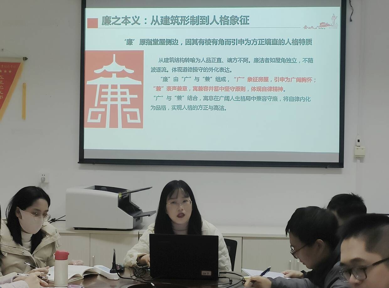杨盈围绕五个维度层层展开,系统阐释了 “廉” 从建筑形制到人格象征的本义,明晰其作为思政教师立身之本的内涵;结合思政教学、科研申报等工作排查廉洁风险点,明确纪律红线;通过教育系统典型违纪案例剖析根源、警示后果;分享廉洁从教先进典型事迹,引导全体教师党员见贤思齐;呼吁大家将廉洁教育融入思政课教学,把个人发展与学校事业结合,以廉洁之风涵养优良师风,坚守初心、担当作为,共同书写学院内涵式高质量发展新篇章。