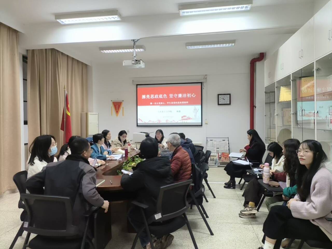 为深入贯彻全面从严治党要求,筑牢教师党员廉洁从教思想防线,切实将廉政教育融入思政课建设全过程,12月25日,马克思主义学院党总支纪检委员杨盈以《擦亮思政底色 坚守廉洁初心》为题,为全院教师党员讲授专题党课,引导全体教师党员在教书育人中坚守廉洁底线,以清正之风涵养优良师德师风。
