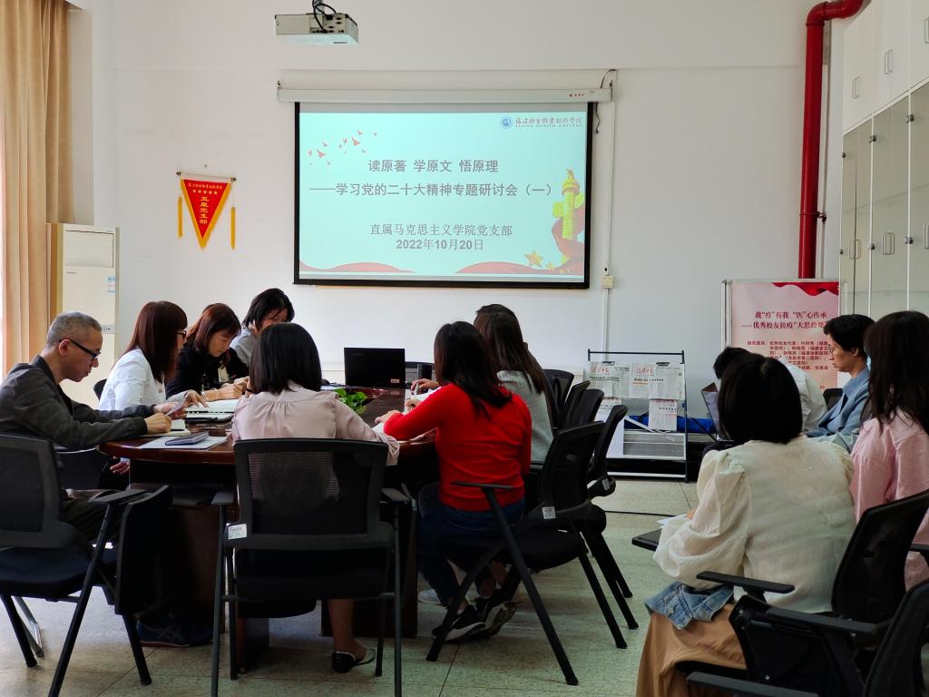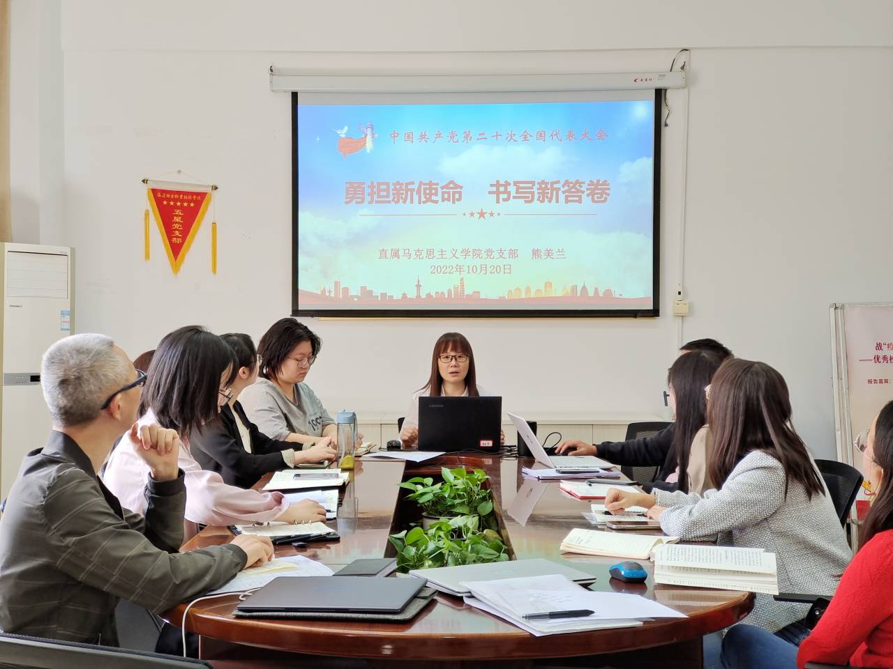 为学习宣传和研究阐释党的二十大精神,用习近平新时代中国特色社会主义思想凝心铸魂,引领新时代青年学生踔厉奋发、勇毅前行,2022年10月20日,直属马克思主义学院党支部在会议室107开展党的二十大报告专题研讨会,活动由党支部书记熊美兰主持。