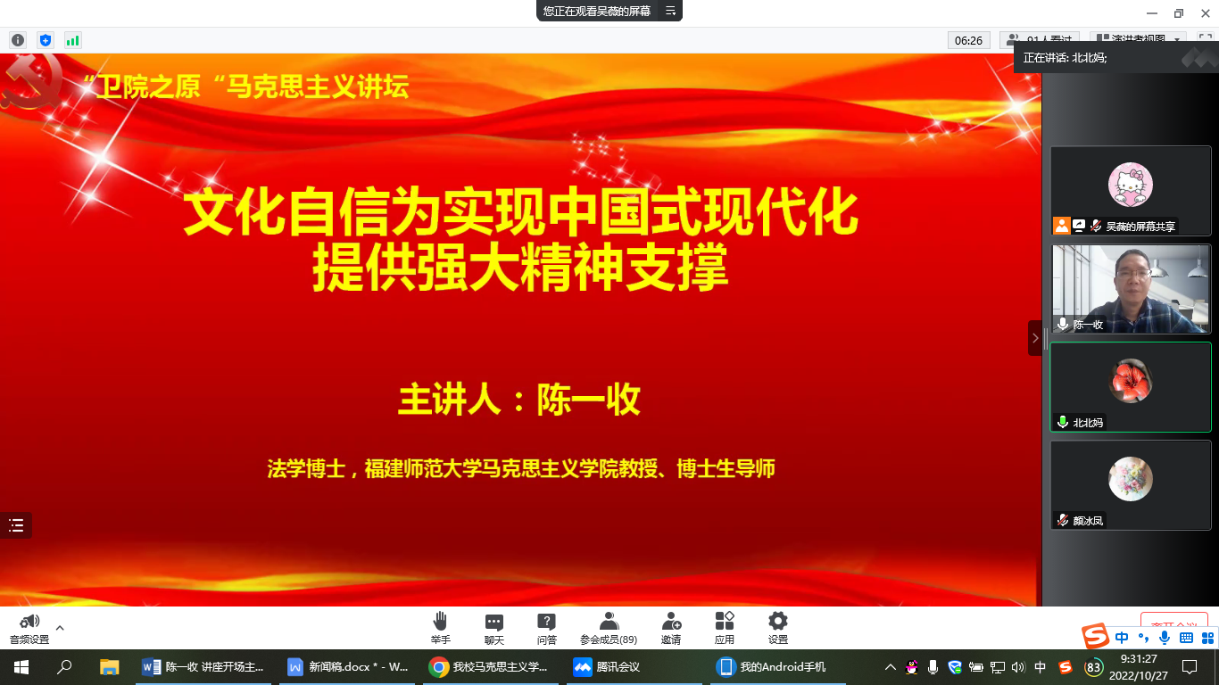 为帮助开云师生学习贯彻党的二十大精神,从中华优秀传统文化中汲取思想精华,从百年党史中感悟文化自信,2022年10月27日,开云马克思主义学院邀请福建师范大学马克思主义学院教授、博士生导师陈一收作题为《文化自信为实现中国式现代化提供强大精神支撑》专题讲座。讲座由马克思主义学院副院长来朋珍主持,全体思政课教师及医学技术系学生代表以线上方式参与。