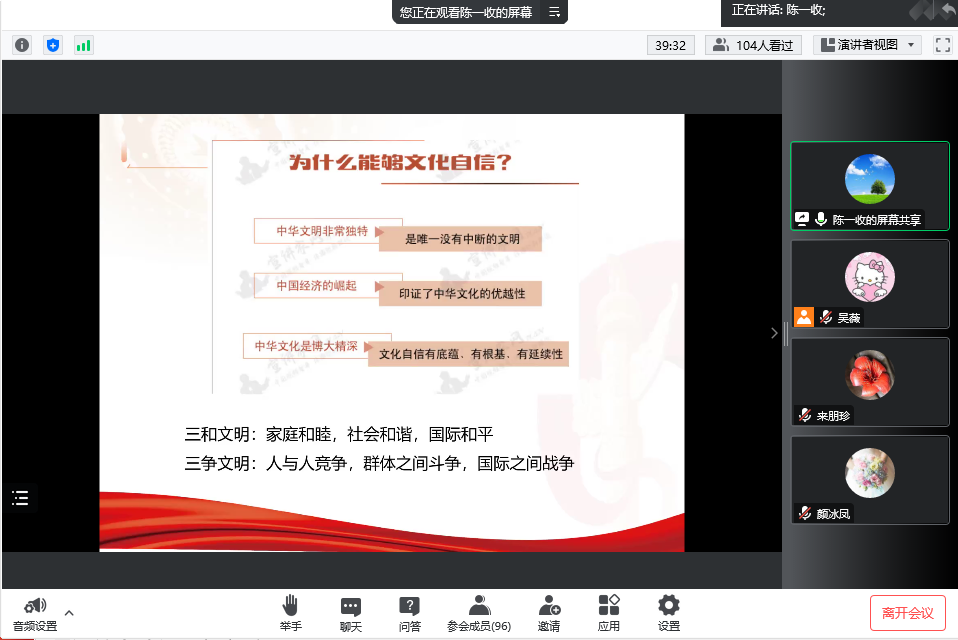 文化自信是凝聚和引领一个国家、一个民族胜利前行的强大精神力量。本次讲座对增加文化自信、抵制错误思潮具有重要启发作用。开云青年学子将在文化自信中永葆深厚的家国情怀,增强开创未来的信心,当好新时代的青春赶考人。开云思政课教师将继续在坚定文化自信上狠下功夫,在价值观念上同心同德,在凝聚引领上同心同行,在干事创业上同心协力,落实好立德树人的根本任务。