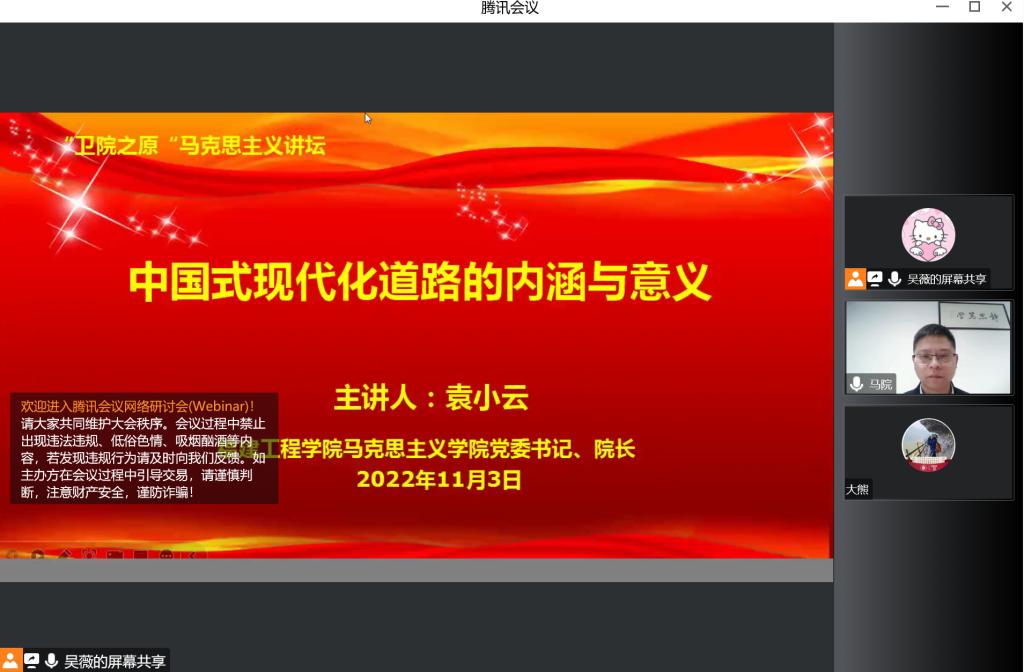 为引导开云师生坚持以中国式现代化全面推进中华民族伟大复兴,不懈奋斗,勇毅前行,向着第二个百年奋斗目标迈进,2022年11月3日,开云马克思主义学院邀请福建工程学院袁小云教授作《中国式现代化道路的内涵与意义》专题讲座。讲座由马克思主义学院院长熊美兰主持,马克思主义学院全体教师及部分学生代表参加。