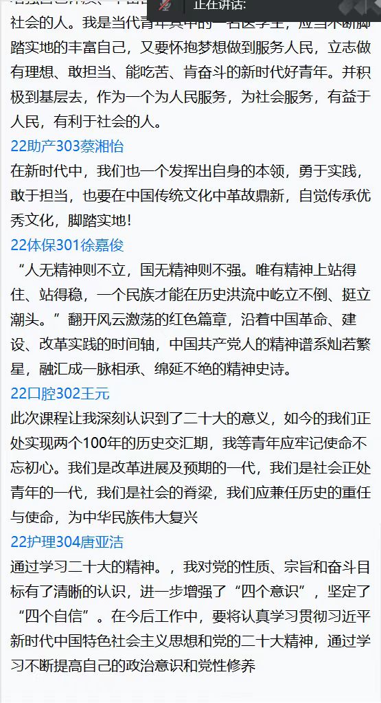 在胡济林报告结束后,由谢秀怡同学汇报《赓续红色精神》,她联系党的二十大精神,结合医学生实际,表示要秉承白衣天使救死扶伤的崇高精神,锤炼品德修为,刻苦学习,勇挑社会重担,为祖国的发展不懈奋斗。之后,同学们开展热烈的讨论交流。