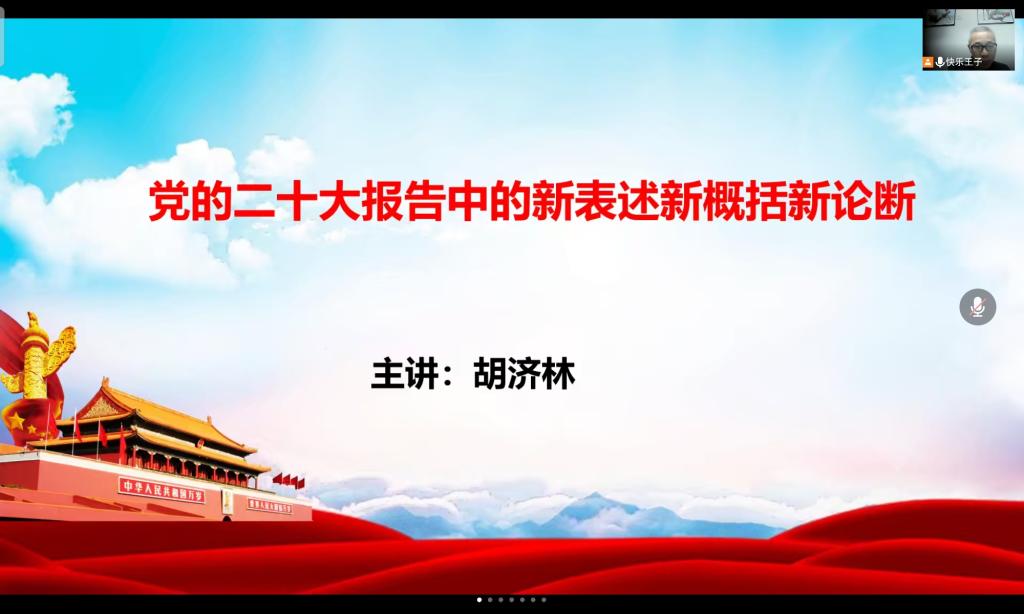 同学们进入腾讯会议后,由胡济林进行《党的二十大报告中的新表述新概括新论断》专题报告,胡济林简要介绍了党的二十大的主题、主要成果和新的中央领导集体,重点阐释了“三件大事”“第二个答案”“归根到底是两个‘行’”“中国共产党的中心任务”“中国式现代化”“六个必须坚持”“五个必由之路”等几个方面的内容。他号召大家要深刻把握党的二十大精神,切实学懂弄通做实习近平新时代中国特色社会主义思想,刻苦钻研,追求真理,为实现第二个百年奋斗目标贡献青春力量。