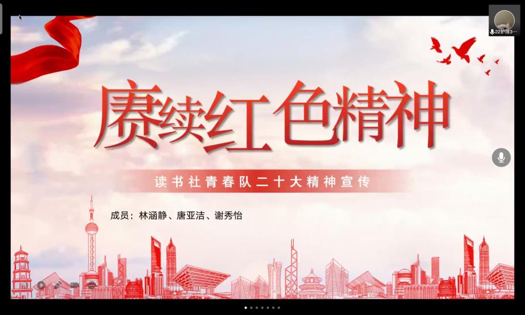 金秋十月,落日余晖。2022年10月16日上午10时,中国共产党第二十次全国代表大会在北京人民大会堂开幕,这是全党全国各族人民迈上全面建设社会主义现代化国家新征程、向第二个百年奋斗目标进军的关键时刻召开的一次十分重要的大会。为了增强同学们对党的二十大基本情况的了解,把握其精神实质,切实增强学习贯彻党的二十大精神的政治自觉和行动自觉,提高同学们身为当代大学生的责任感与使命感,提升综合素质,习近平新时代中国特色社会主义思想读书社青春队于2022年10月29日晚,在马克思主义学院教师胡济林的指导下开展线上小队学习交流。