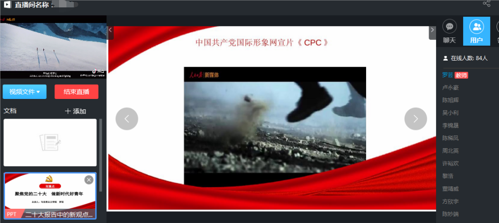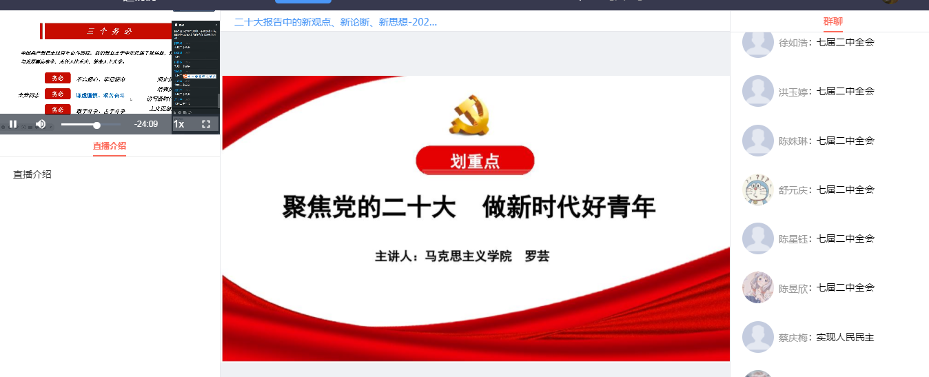 2022年11月9日,习近平新时代中国特色社会主义思想读书社原梦队、21级党史课选课学生代表齐聚云端,马克思主义学院罗芸老师开展了以“聚焦党的二十大 做新时代好青年”为主题的宣讲。此次活动是马克思主义学院学习贯彻党的二十大精神系列宣讲活动之一。