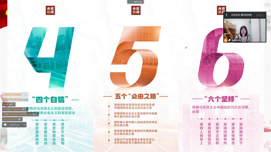 2022年11月9日,传统节日研习社、21级新中国史选课学生代表齐聚云端,马克思主义学院颜冰凤老师开展了以“党的二十大报告中的新观点、新论断、新思想”为主题的宣讲。此次活动是马克思主义学院学习贯彻党的二十大精神系列宣讲活动之一。
