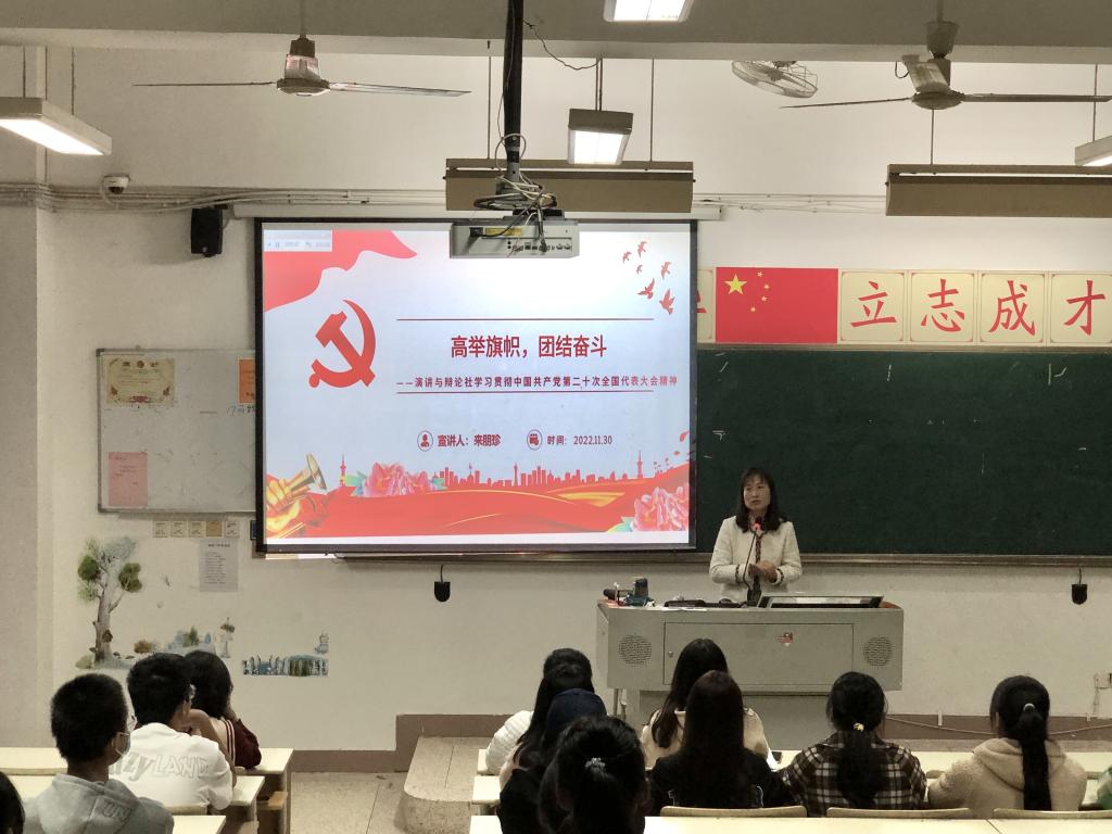传精神火种,聚奋进力量。为深入学习宣传贯彻党的二十大精神,2022年11月30日,演讲与辩论社指导老师来朋珍在教学楼315教室对全体社团成员开展了“高举旗帜奋斗团结”为主题的学习党的二十大精神宣讲。