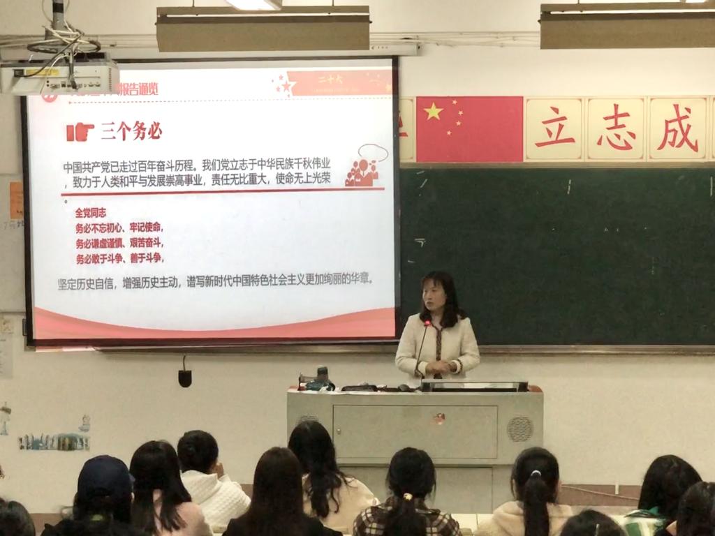 来朋珍老师从“三个务必”“五个重大原则”“五个必由之路”等方面详细介绍了党的二十大报告的一系列重要论点,引导同学们深入学习贯彻党的二十大精神,深刻理解党的二十大召开的重大意义,同时也激励同学们更加紧密地团结在以习近平同志为核心的党中央周围,高举中国特色社会主义伟大旗帜,坚定道路自信、理论自信、制度自信、文化自信,为全面建设社会主义现代化国家、全面推进中华民族伟大复兴而团结奋斗勇敢奋斗。