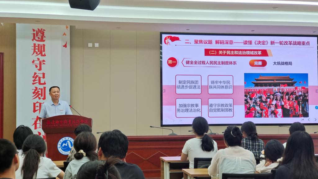 2024年9月12日,校党委书记曾武祈在行政楼六楼会议室为马克思主义学院党总支全体教师党员作题为“同心擘画改革新蓝图 携手奋进强国新征程”党课。