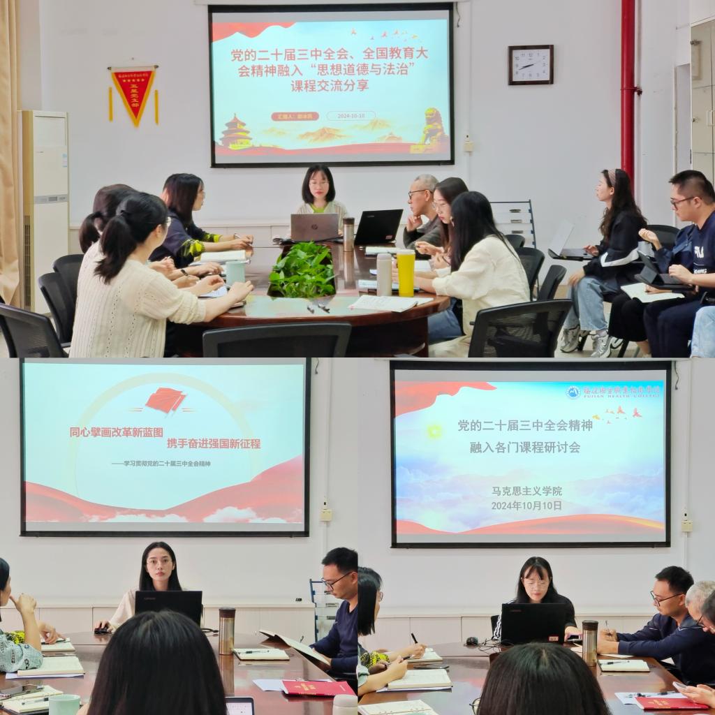 接着,颜冰凤老师分享了党的二十届三中全会精神融入“思想道德与法治”具体案例,提出要以问题为导向,结合党的二十届三中全会、全国教育大会精神和教学重难点设置问题链,精心组合情景式教学、自主探究、案例分析等多种教学方式和手段帮助学生突破教学重难点,提升学生学习实效。张茵珠老师根据“形势与政策”开学第一课及校领导关于学习贯彻党的二十届三中全会精神专题内容所提建议,结合近期培训学习收获谈到要准确理解党和国家理论政策,通过科学严谨的方法在教学过程中证明并展示政策的正面效应。龙慧老师聚焦“高职医学生职业发展与就业创业”课程进行分享交流,党的二十届三中全会和全国教育大会为职业发展与就业创业指明了方向,将会议精神融入课程,有利于让学生明白当前国家就业形势和政策,引导学生根据国家需要和社会需求规划自己的职业,选择合适的就业方向。