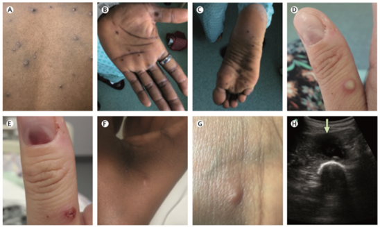 猴痘是由猴痘病毒引起的一种人兽共患病,病毒存在分支I和分支II两种毒株类型,其中分支I毒株的临床严重程度更高,病死率可达10%。人感染猴痘病毒后主要表现为显性疾病,也存在无症状感染者,潜伏期在5—21天之间,通常为1—2周。前驱症状约1—5天,发病早期可出现发热、头痛、背痛、肌痛和淋巴结肿大等前驱症状。通常在热退后出现皮疹和或黏膜疹等病变,但有些病例病变可能出现在前驱期或全身症状之前。猴痘引发的皮疹可单个或多个,通常皮疹经过斑疹、丘疹、疱疹、脓疱和结痂阶段,不同阶段皮疹可同时存在,可伴明显痒感和疼痛。猴痘病变可累及口腔咽喉黏膜、肛门、直肠、生殖器、结膜和角膜等。结痂脱落后可遗留红斑或色素沉着,甚至瘢痕,瘢痕持续时间可长达数年。猴痘病毒的宿主尚不明确,目前认为非洲啮齿类(非洲松鼠、树松鼠、冈比亚袋鼠、睡鼠等)可能为其自然宿主。传染源包括感染的啮齿类动物、灵长类动物、猴痘病人,其中病人出现症状后至皮疹结痂自然脱落前均具有传染性。