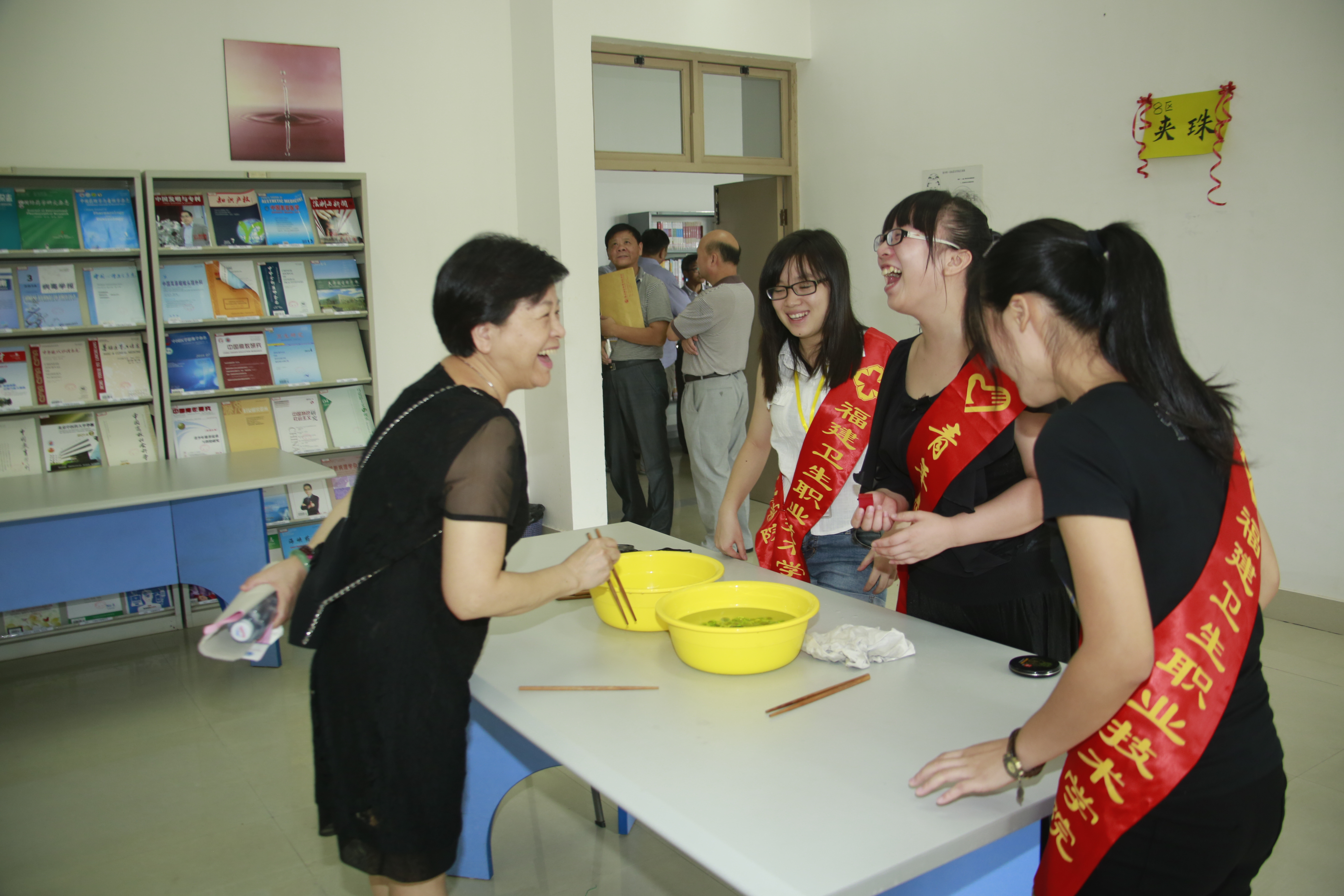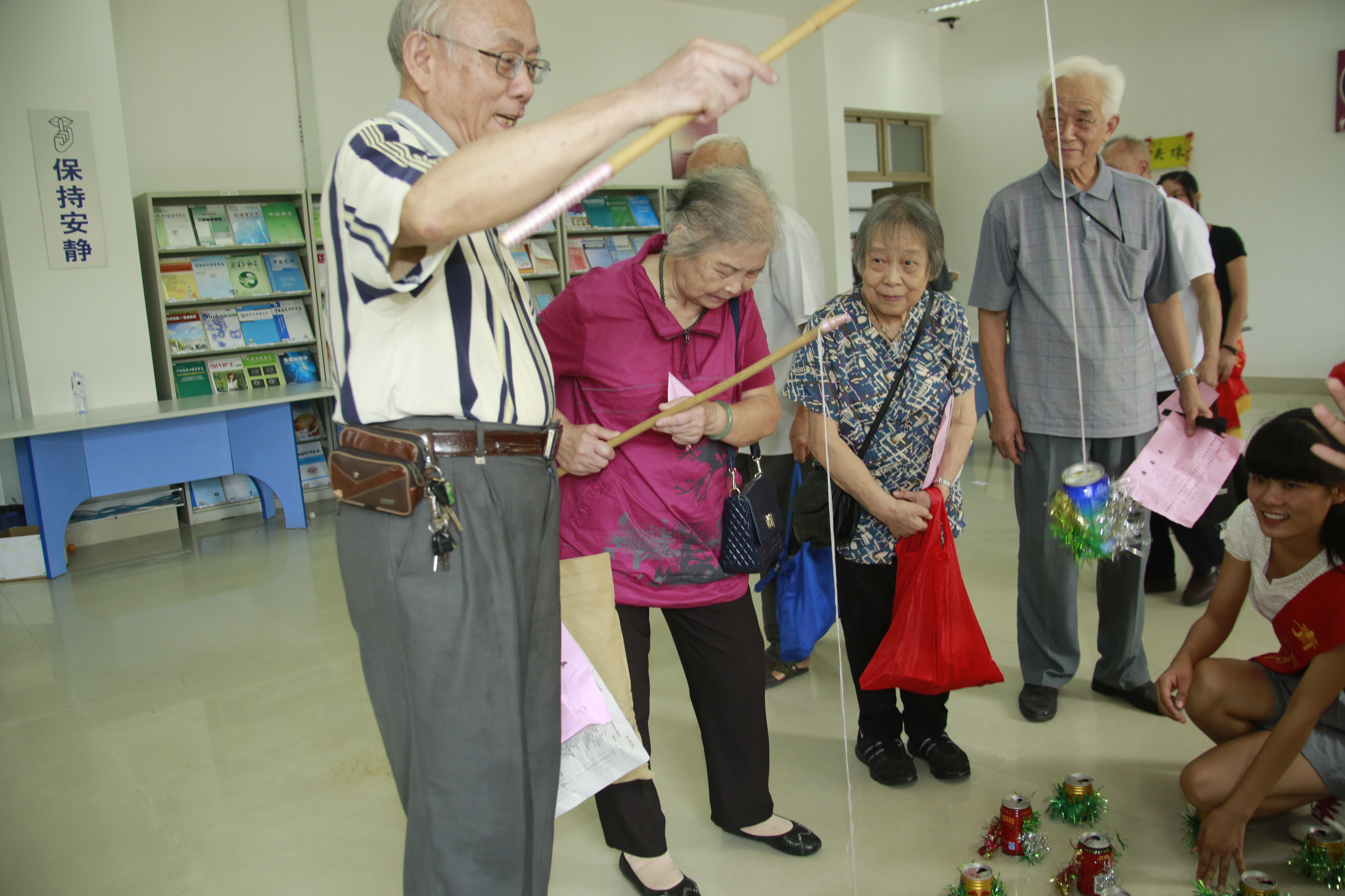 座谈会后,离退休教职工参加了由学生志愿者为他们安排的文体活动。猜谜、投“篮”、钓“鱼”、“卖油翁”等八个项目。活动中,孩子们精心准备、热情协助、温馨关怀让老同志们倍感亲切,感叹“回校真好!”