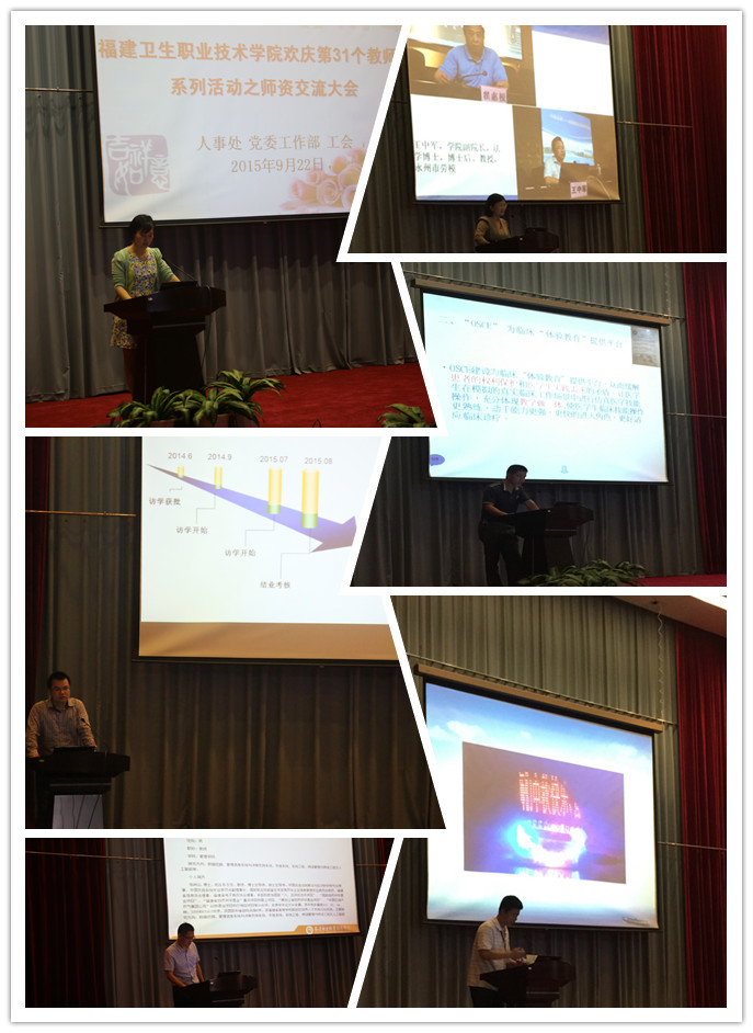 会上,公共基础部李其铿老师分享了他在福州大学工程学院参与科研项目、教学及技术讲座过程中的所学所得,最后重点介绍了现代电子设备在医疗专业中的应用,尤其是医疗电子支付的快捷性与方便性,并给广大教师提出“互联网+护理、互联网+课程……”等新校本研究、研发思路;药学系邓元荣老师介绍了他在福建农林大学生命工程学院访学所得,并就科研工作展开,为相关专业介绍最新研究动态,指出对比其它学校,开云药学系有很大提升空间,可在药物机理研究方面进行挖掘,在研究方法上创新、拓展,注重保健产品的开发。护理系洪霞老师与医学基础部林浩老师介绍了暑期赴台湾大仁科技大学骨干教师培训情况,与大家分享了在台湾大仁科技大学的培训内容、体会与感想、反思与感悟,让大家对台湾职业教育的现状有了直观的了解:鼓励学生在安全环境下表达自己,以团体游戏的方式挖掘学生的潜能;林浩老师重点介绍了台湾OSCE技能考试站的设计与布局,强调体验式教育与教学结合有利于提高教学效果。护理系刘一群老师就暑期参加骨干教师国家级培训的培训内容和心得体会向大家进行了汇报,并简单介绍了永州职业技术学院的特色专业、微课及临床教学医院相关情况。最后,医学技术系陈文山老师向大家介绍了暑期参加威海职业技术学院骨干教师国家级培训的情况,重点向大家介绍了电子信息技术在课堂中的应用,并以培训时自主研发的电子设备小作品为全体在场教师送上中秋节的祝福。