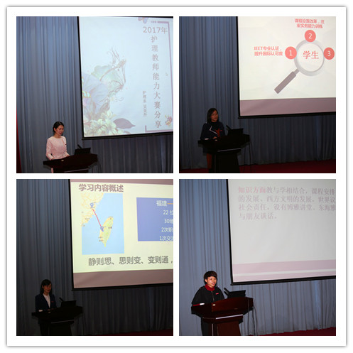 会上,护理系吴美丹老师、马克思主义学院胡济林老师分享了参加全国教师教学能力大赛经验,吴美丹老师还按照国赛要求进行现场说课展示。基础部叶榕老师、药学系叶桦珍老师和护理系洪霞老师分别介绍了他们在香港浸会大学、美国休斯敦大学访学研修的生活、科研和学习经历。医学技术系彭臻菲博士、临床医学系张蕴博士和健康管理系苏碧凤老师汇报了赴台湾培训学习的心得体会。八位教师通过培训进修,既有各自专业上的收获,也学习到其他院校在教学、科研、育人方面的先进理念,通过学习培训,他们有了新的想法和理念,也通过此次交流会把个人的所学所得分享给全校的教师,扩大了培训的成效。