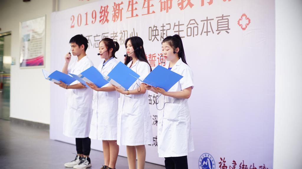 活动开始前陈戴和老师以饱满的热情对学生进行生命教育宣讲:大体老师安静地躺着,虽无言,然师恩如山;他们生命终了,却用爱为人师表 ,引导着医学生在求学路上认识生命、感恩生命,并身体力行,践行医者担当,让刚踏入医学院校的新生感受了遗体捐献者的无私奉献。活动中,郑亚妮老师带领同学们进行解剖学誓词的宣誓仪式,“无言良师,授吾医理;敬若先贤,临如活体;谨言躬行,追深辨细;德彰术精,锤成大医”,响亮的誓词在基础部回荡,这是医学生步入医学殿堂之后重要的一堂课,学好医学首先从尊重“无言良师”开始。宣誓结束,临床医学系王莹、缪伟阳、赵思琪、白静雯四位同学进行了配乐诗朗诵《生命的永恒光辉》,同学们沉静在凝练的诗词中“生命是真实的,生命是诚挚的,死亡并不是他们的终结点,生命的价值不在于伟大,而在于能够给世界带来奉献,我们将牢记教导,始终不放弃对生命的希望……”