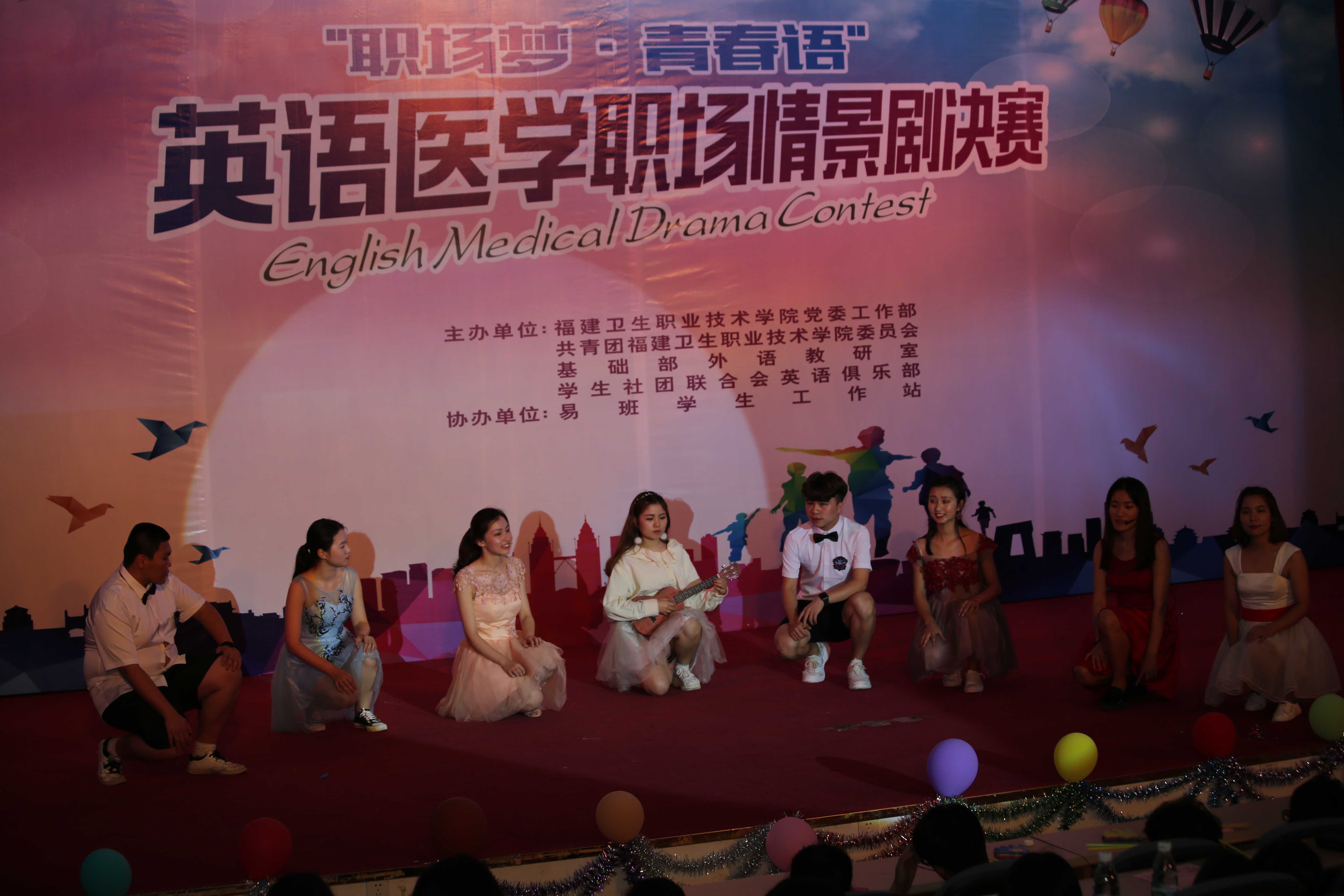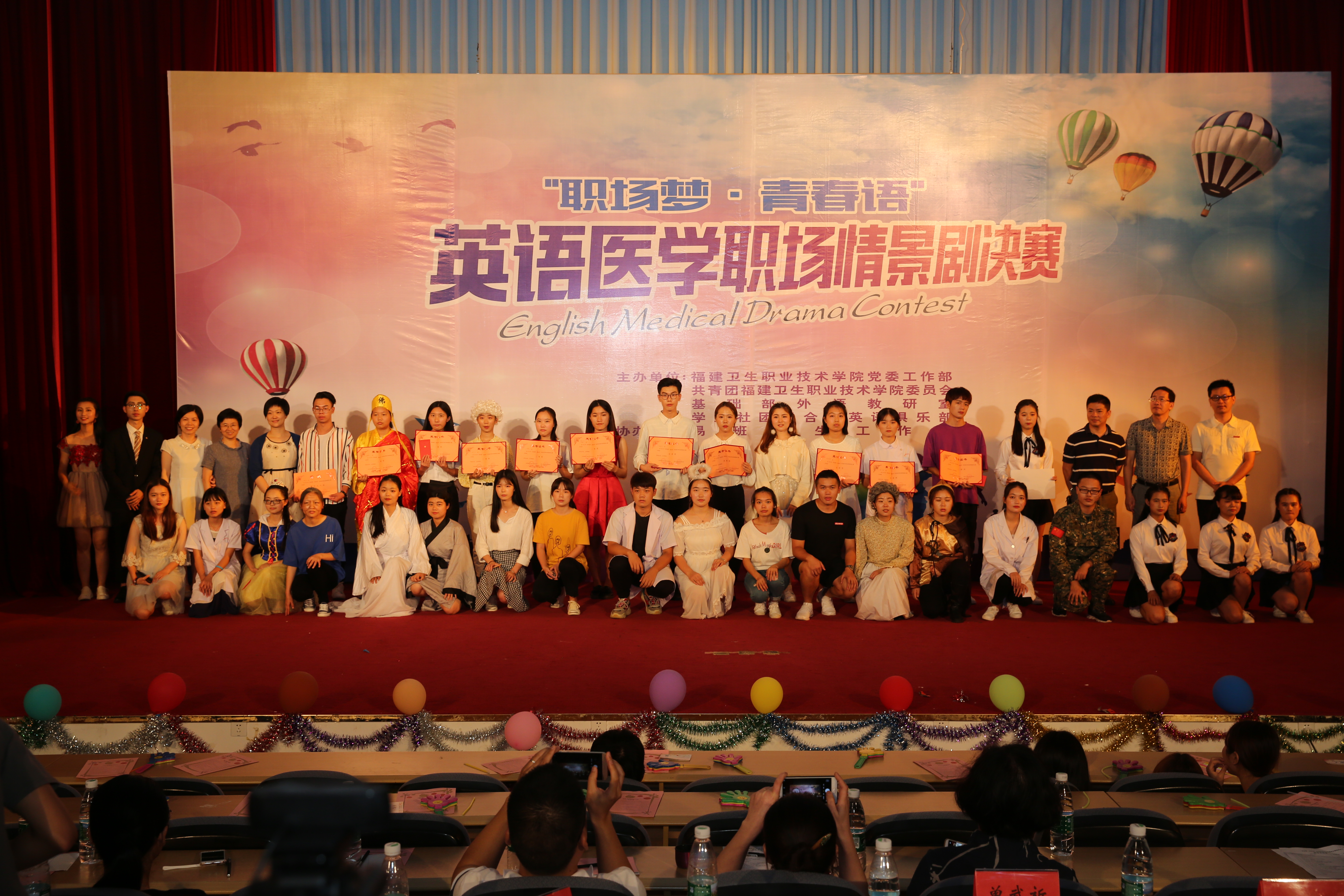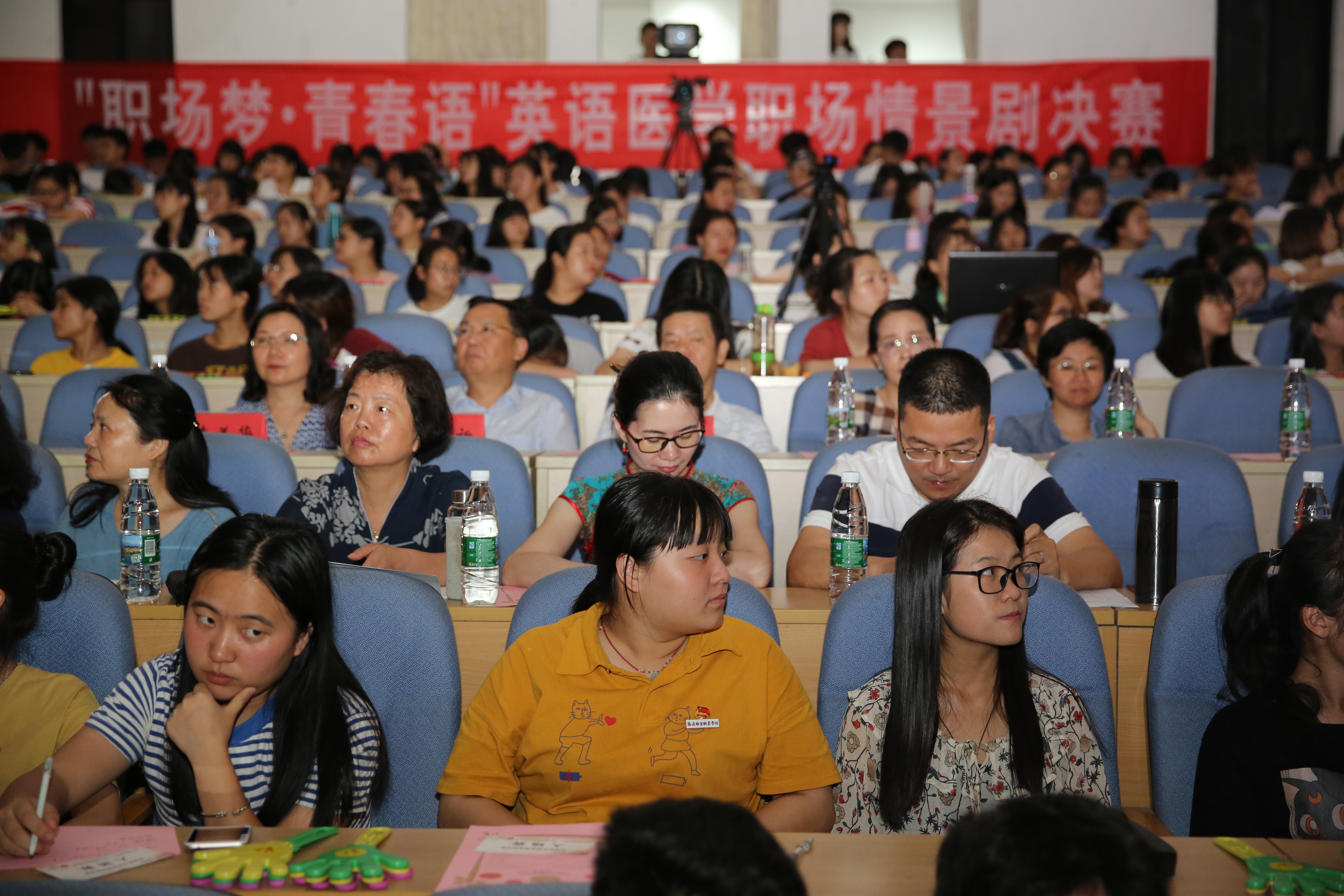 为践行十九大,弘扬医德医风,丰富校园文化生活,探索医学英语教学新模式,2018年6月12日,由学院党委工作部、院团委、基础部外语教研室联合主办的“职场梦·青春语”英语医学职场情景剧决赛在学术厅隆重举行,院党委曾武祈书记、院党委林建团副书记、院纪委李美华书记、学院郑翠红副院长以及相关职能处室、系部领导莅临比赛现场。