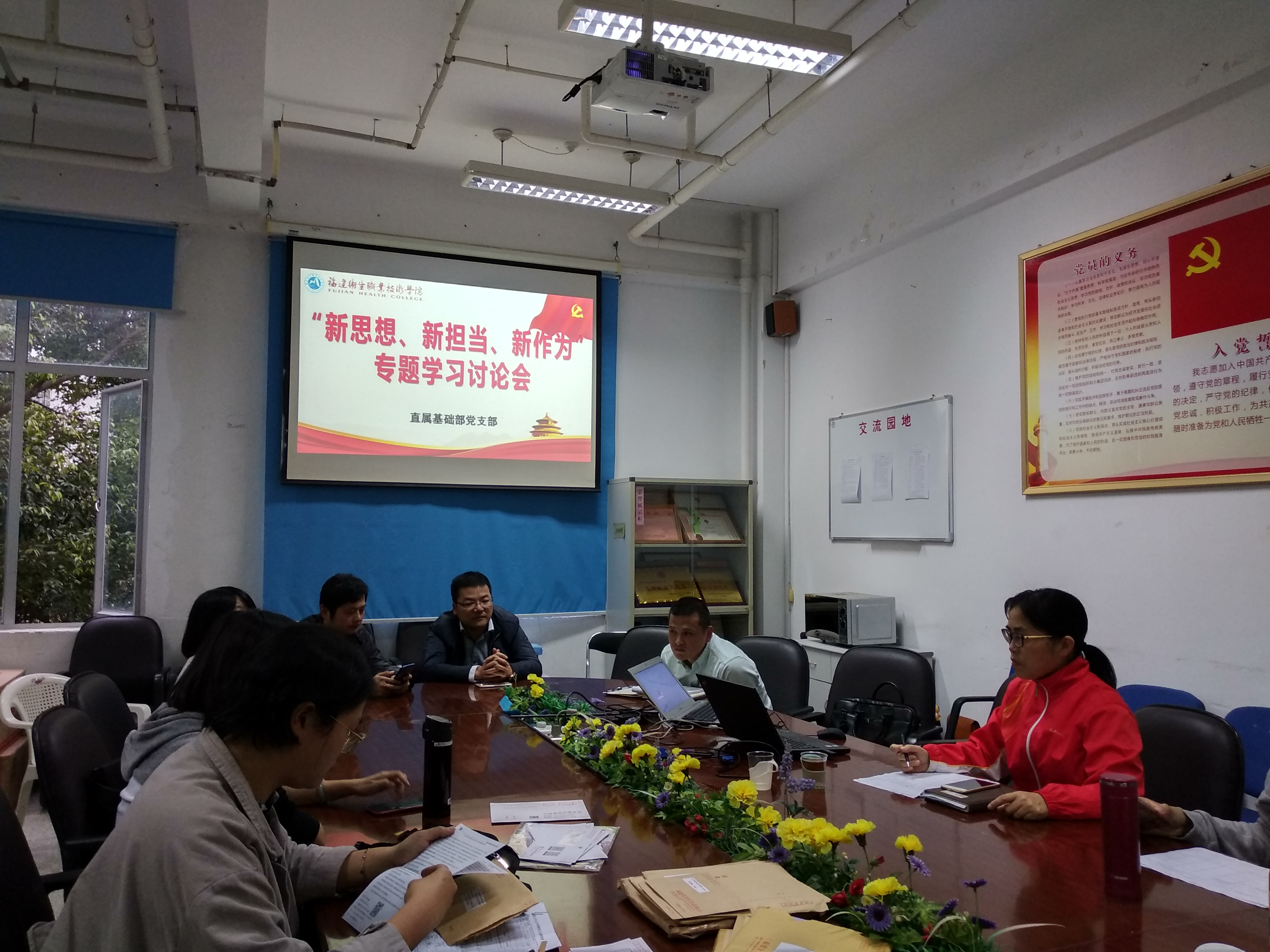 为深入学习习近平新时代中国特色社会主义思想和党的十九大精神。进一步激励直属基础部党员教师新思想、新担当、新作为,充分调动和激发支部党员队伍的积极性、主动性、创造性。2018年10月18日下午,直属基础部党支部开展“新思想、新担当、新作为”专题学习讨论活动,结合自己的体会围绕“新时代、新担当、新作为”主题内容,从党员教师为什么要担当、怎么担当等方面进行了热烈讨论。
