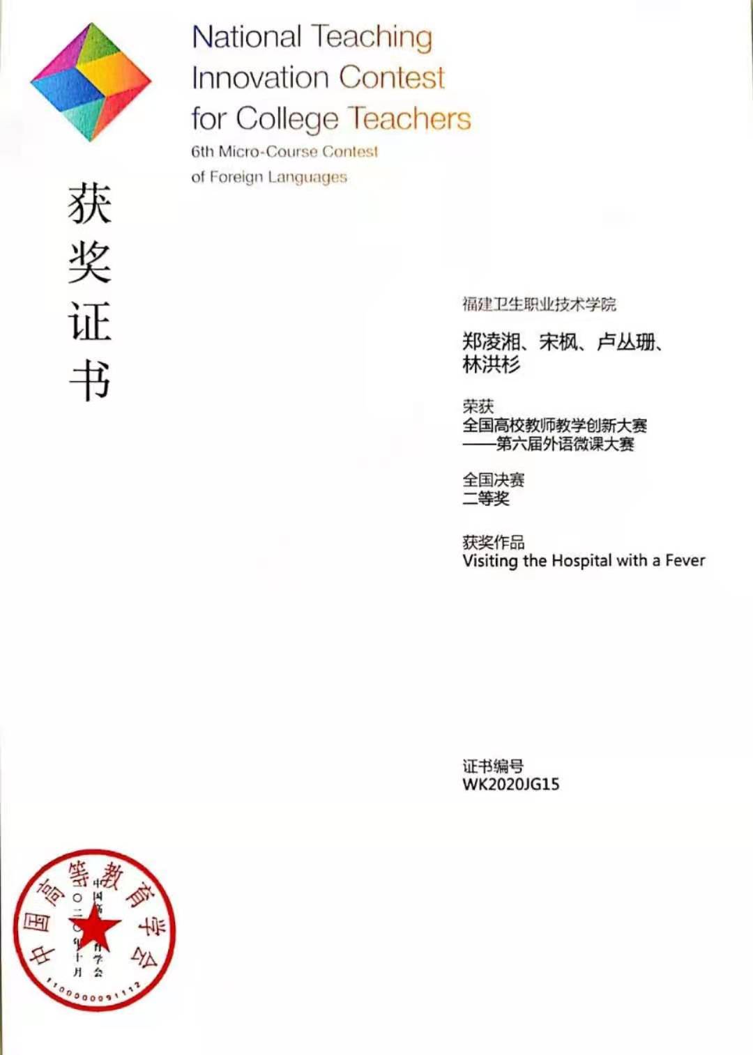 近日,“全国高校教师教学创新大赛——第六届外语微课大赛”全国决赛落下帷幕。本届大赛共有来自30个省、市、自治区的1,102所院校的4,000余名教师深度参与,共收到作品2,590件。经过初赛推荐、复赛评审,决赛角逐等多轮激烈比拼,人文教学部郑凌湘、宋枫、卢丛珊、林洪杉老师团队作品《Visiting the Hospital with a Fever》成功斩获全国决赛二等奖。
