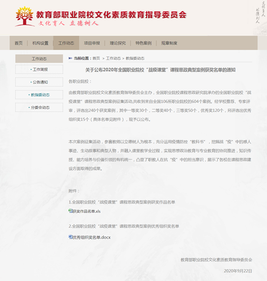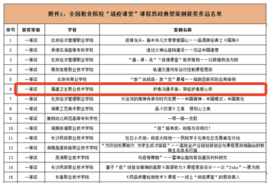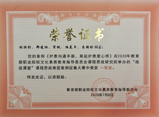 近日,教育部职业院校文化素质教育指导委员会公布2020年全国职业院校“战疫课堂”课程思政典型案例获奖名单。我院人文教学部以“护患沟通手册,架起护患爱心桥”课程思政案例,荣获一等奖。