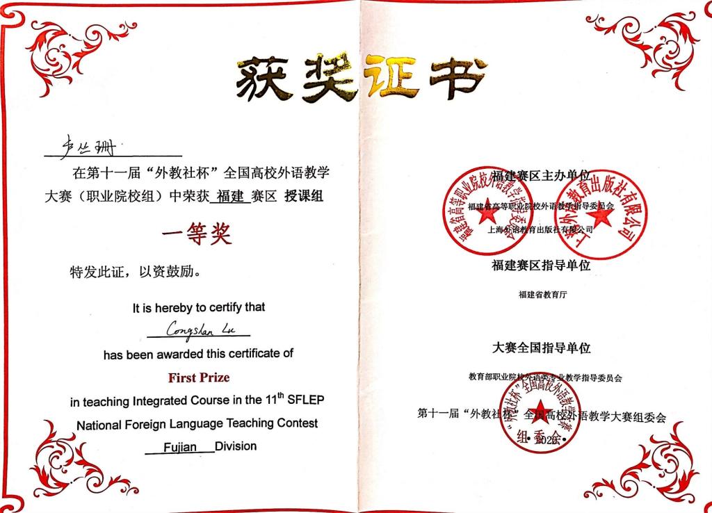 2020年11月,我院人文教学部卢丛珊老师积极参加第十一届‘外教社杯’全国高校(职业院校组)外语教学大赛福建赛区比赛。在初赛、复赛、决赛中的现场教学、说课、问答三个环节中,其与全省多所学校外语教师展开激烈的角逐,最终获得一等奖。