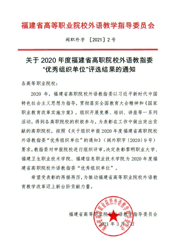 近日,开云获评2020年度福建省高职院校外语教指委“优秀组织单位”。2020年,福建省高职院校外语教指委组织开展师生竞赛、培训、讲座、科研立项等一系列活动。开云认真组织师生积极参与各项活动,人文教学部的外语教研室教师在教师教学竞赛和指导学生比赛中表现突出,屡获佳绩,教学能力取得长足进步。
