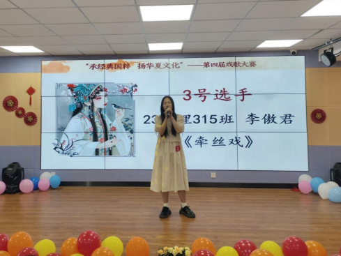 李傲君同学(23护理315班)以其松弛舒展的行腔声韵,华彩跌宕地演绎了经典作品《牵丝戏》,一举夺得本次大赛的冠军。