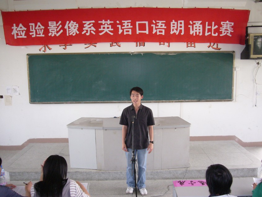 为响应学院艺术节号召,检验影像系于4月10日下午在第2阶梯教室举行英语口语朗诵比赛。担任此次比赛的评委是英语教研组的三位老师:洪斯汶老师、李园源老师和周微琳老师。