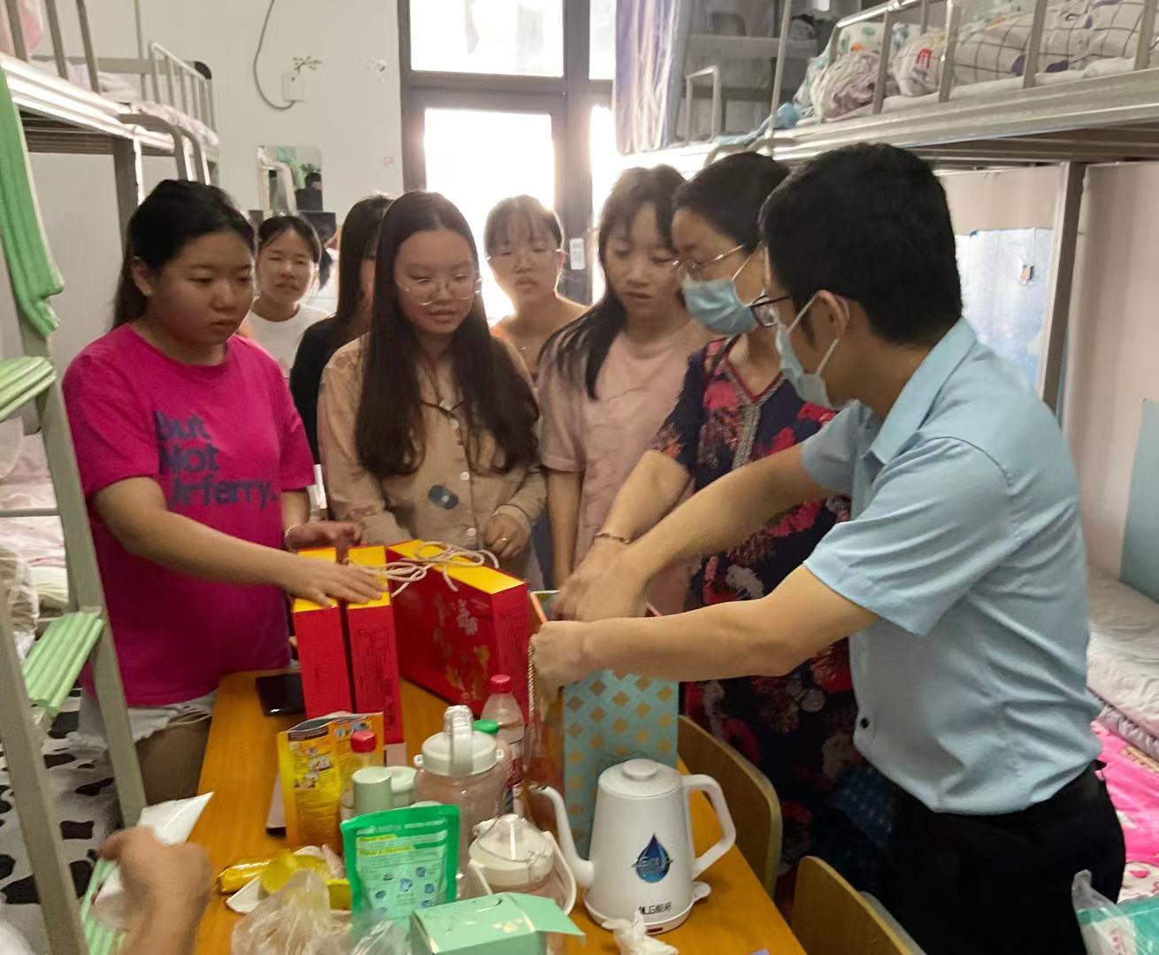 同日下午,院系领导和辅导员前往13号宿舍楼看望集中隔离的29名学生,为他们发放中秋月饼、口罩和免洗消毒液防疫物资,询问隔离学生的住宿、饮食、学习、身体健康等情况,鼓励学生保持良好的心态,按要求完成学习任务。有困难及时进行沟通联系,积极配合医学观察,确保健康安全平稳渡过隔离期。