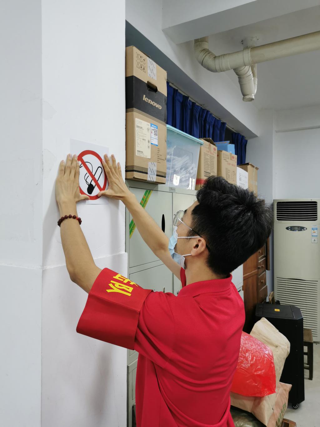 会后体育部党员先锋队,对体育部办公室和器材室进行巡查,并张贴了禁烟标识。