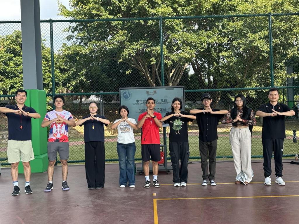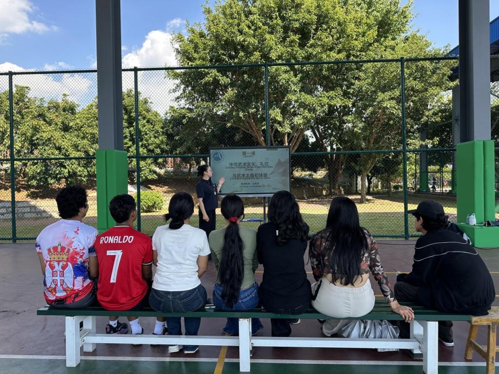 课堂伊始,刘芳芳老师讲授了太极拳数百年的历史传承以及文化内核,并以抱拳礼动作的学习为切入点,将“以礼始、以礼终”的武德精神与和谐包容的价值理念灌输给国际生,现场学生表现出极大的学习兴趣,在随后的教学过程中,刘芳芳老师从太极拳基础招式开始分解教学,并穿梭于学生之间进行一对一指导,留学生们认真揣摩,积极互动,在汗水中体会着中国功夫的独特神韵与文化美感。