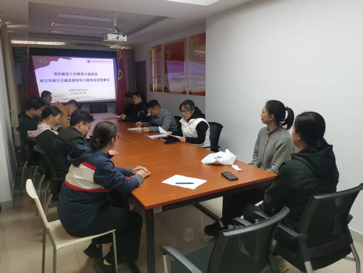 3月12日,直属体育部党支部召开党员会议,传达学习学校党的建设工作领导小组会议精神,研究部署支部开展树立和践行正确政绩观学习教育工作。支部书记阮秋容主持会议并作动员讲话,支部副书记、体育部主任王钝锐及支部全体党员、部门非党员骨干教师参加会议。